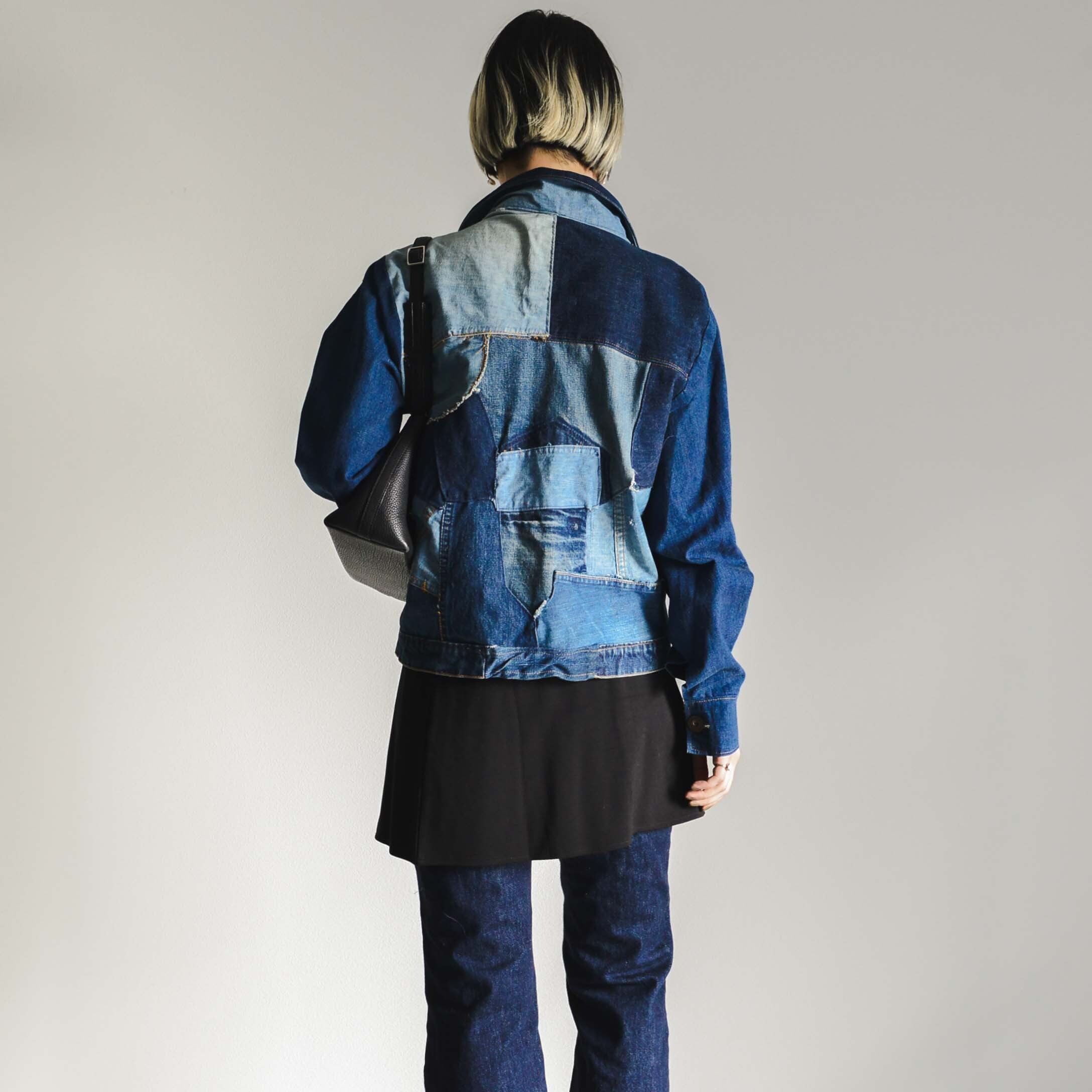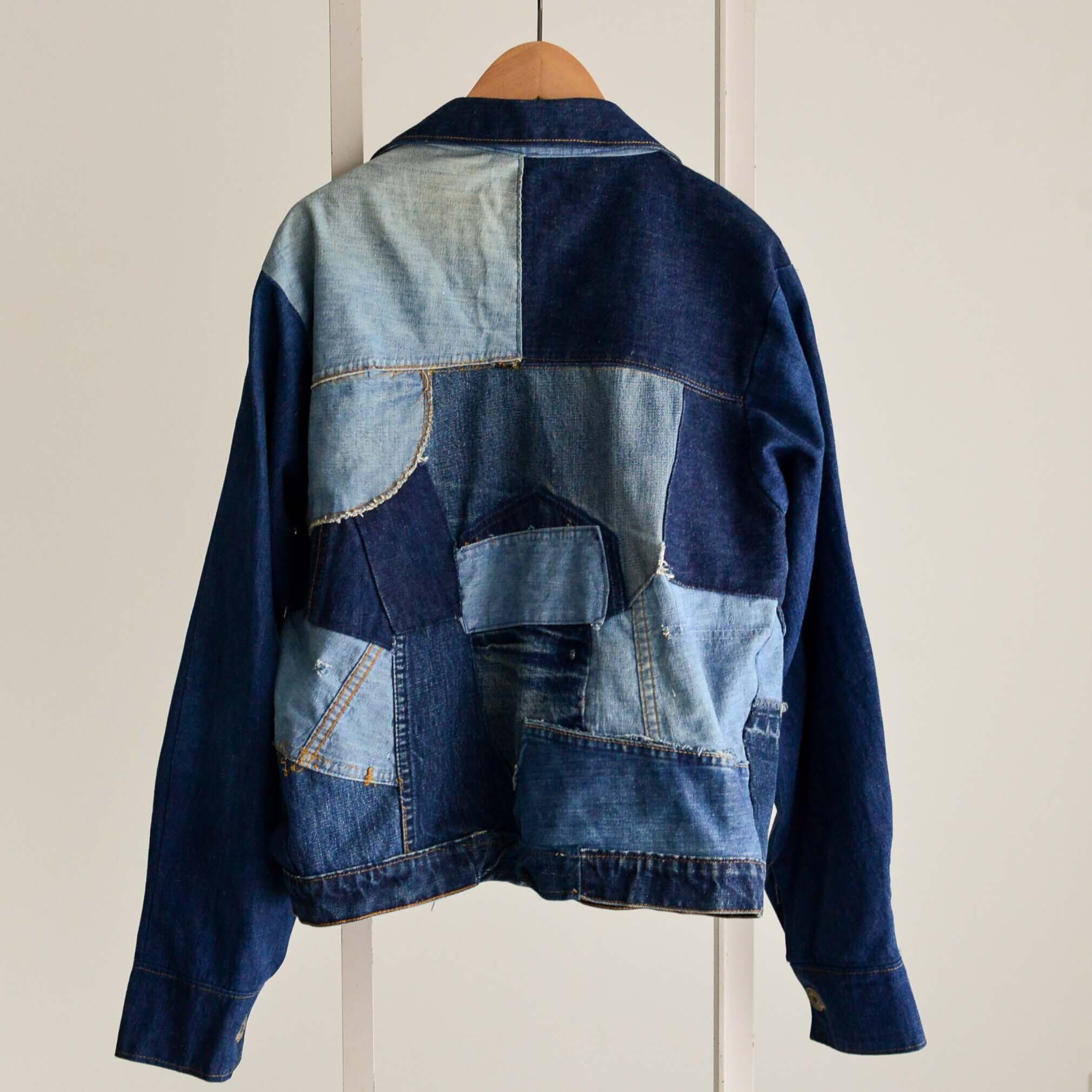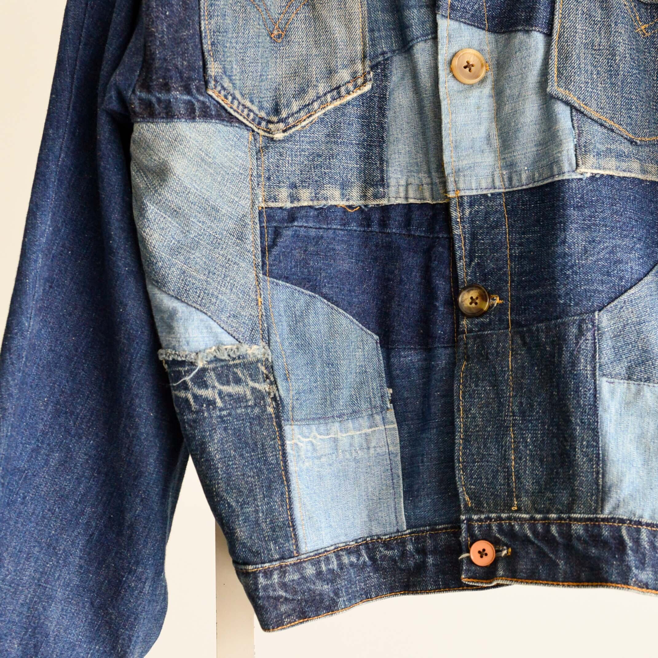 風合いや色、厚さが違うさまざまなデニムで作られたパッチワーク。