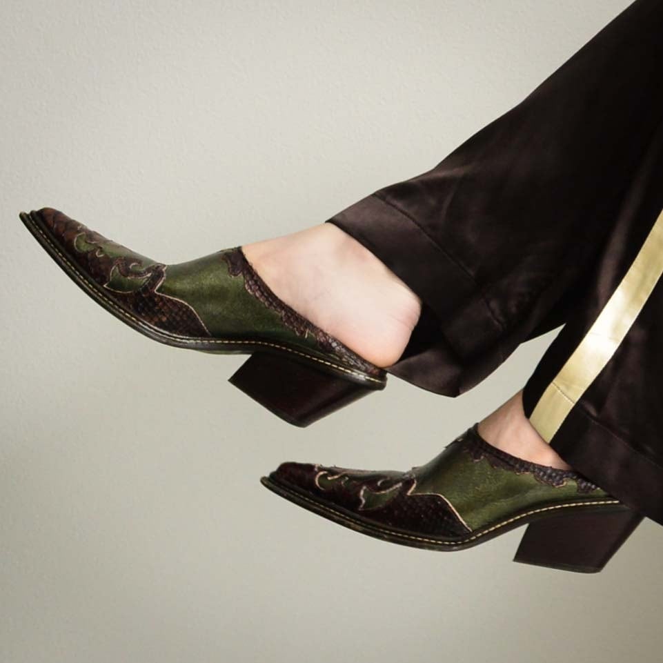 ブラウンのパイソンとカーキ色のメタリックレザーのコンビが美しい。