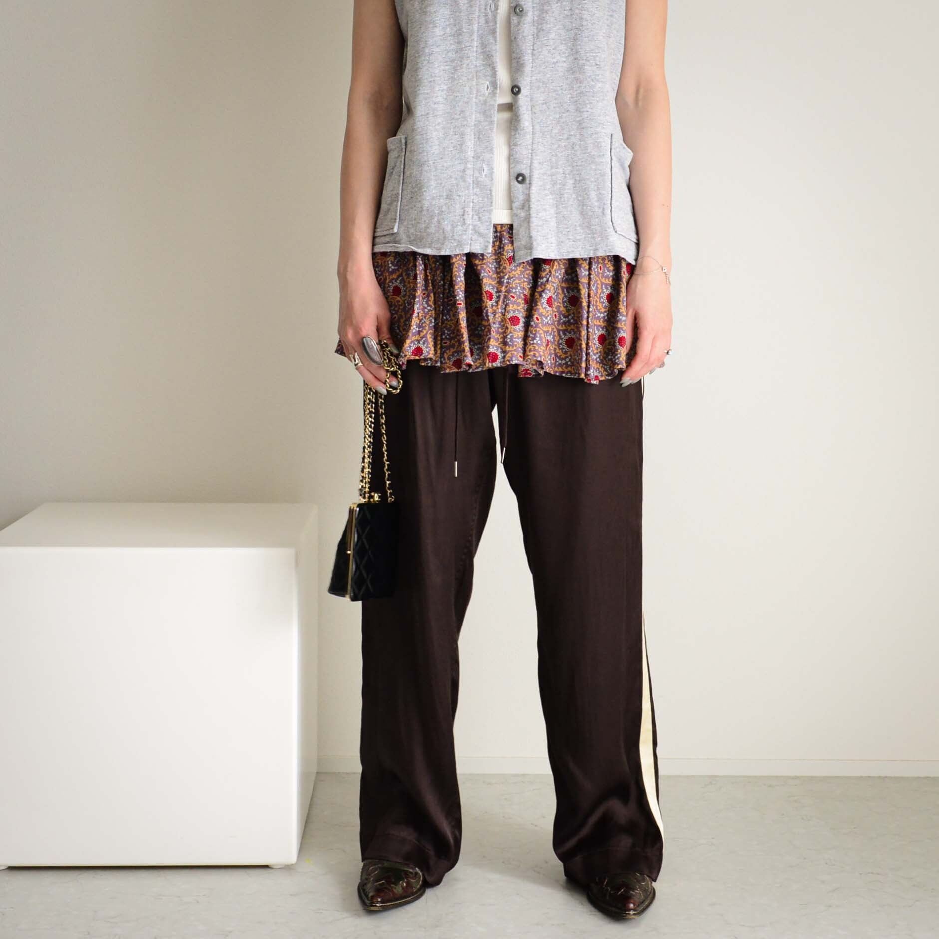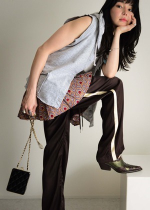 タンクトップとスラックスのミニマルなスタイリングにさくっと合わせたり、