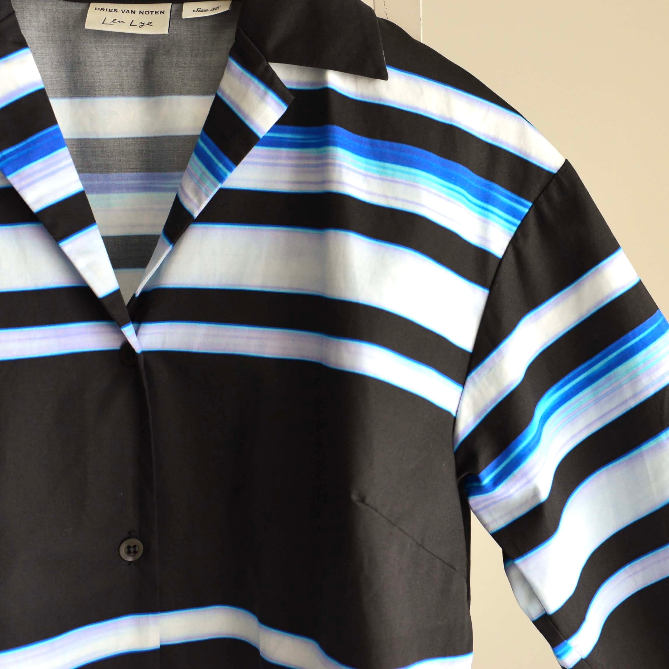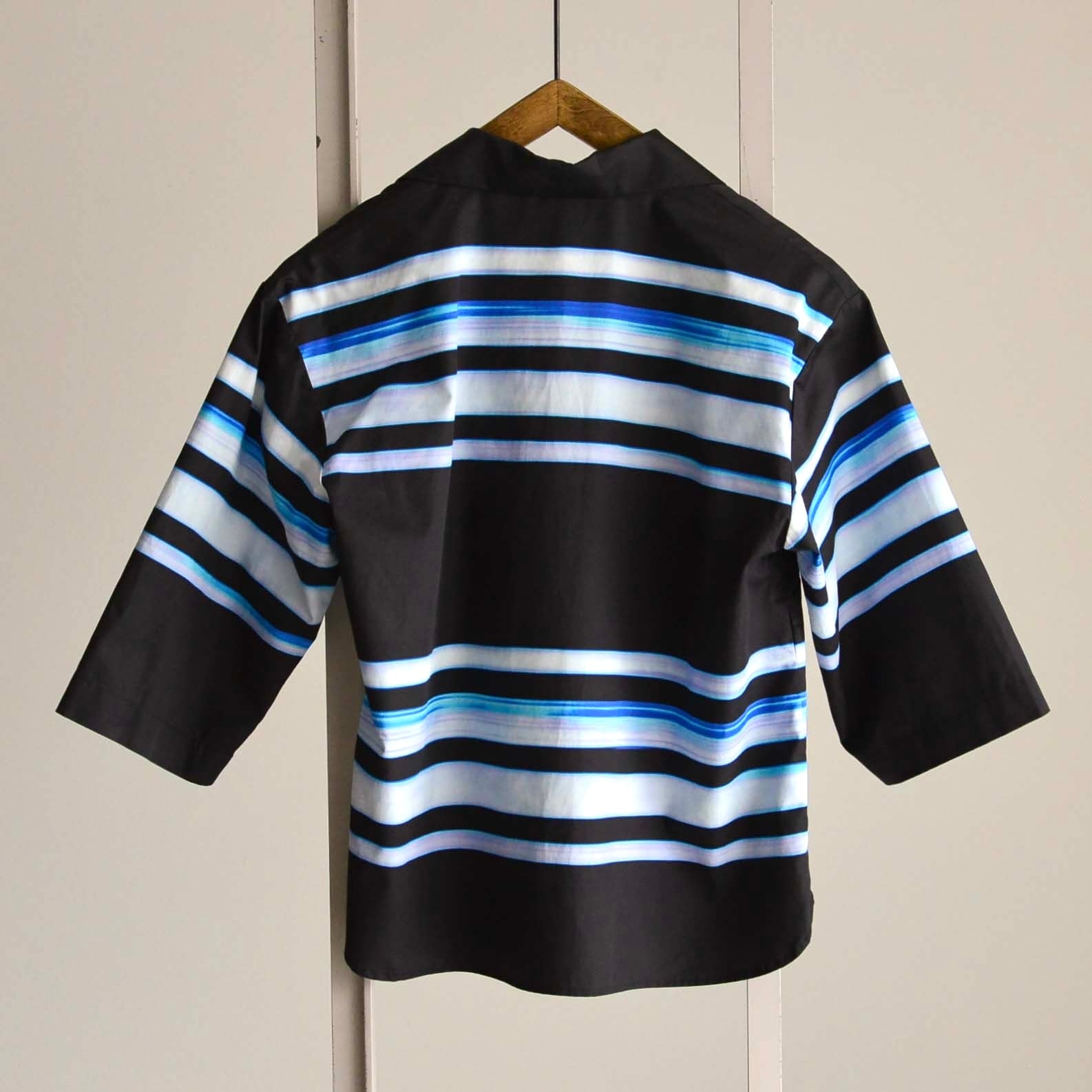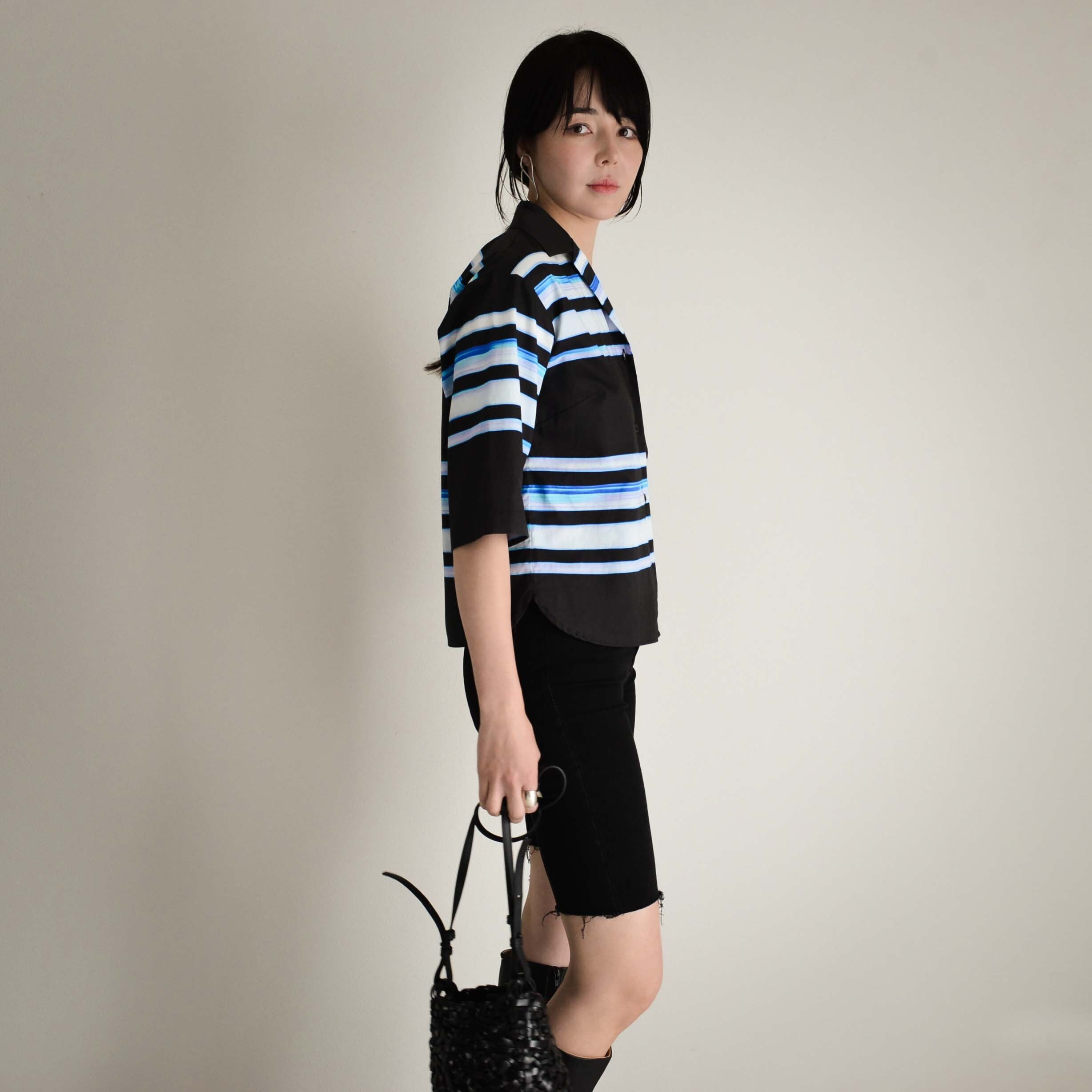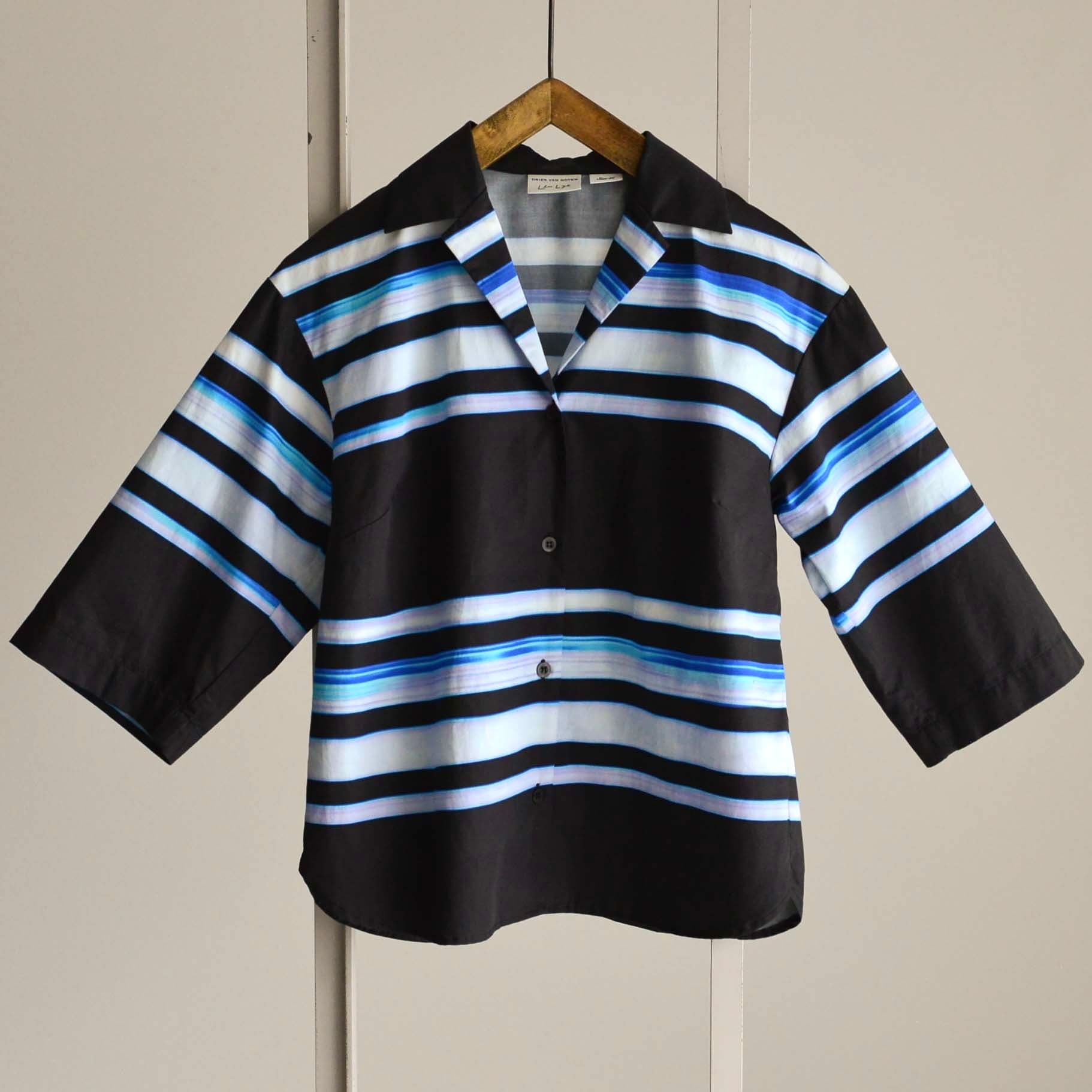 ハリがある高密度の上質なコットン素材にプリントされたのは、黒闇に走る閃光を思わせるホワイトとブルーのボーダー。