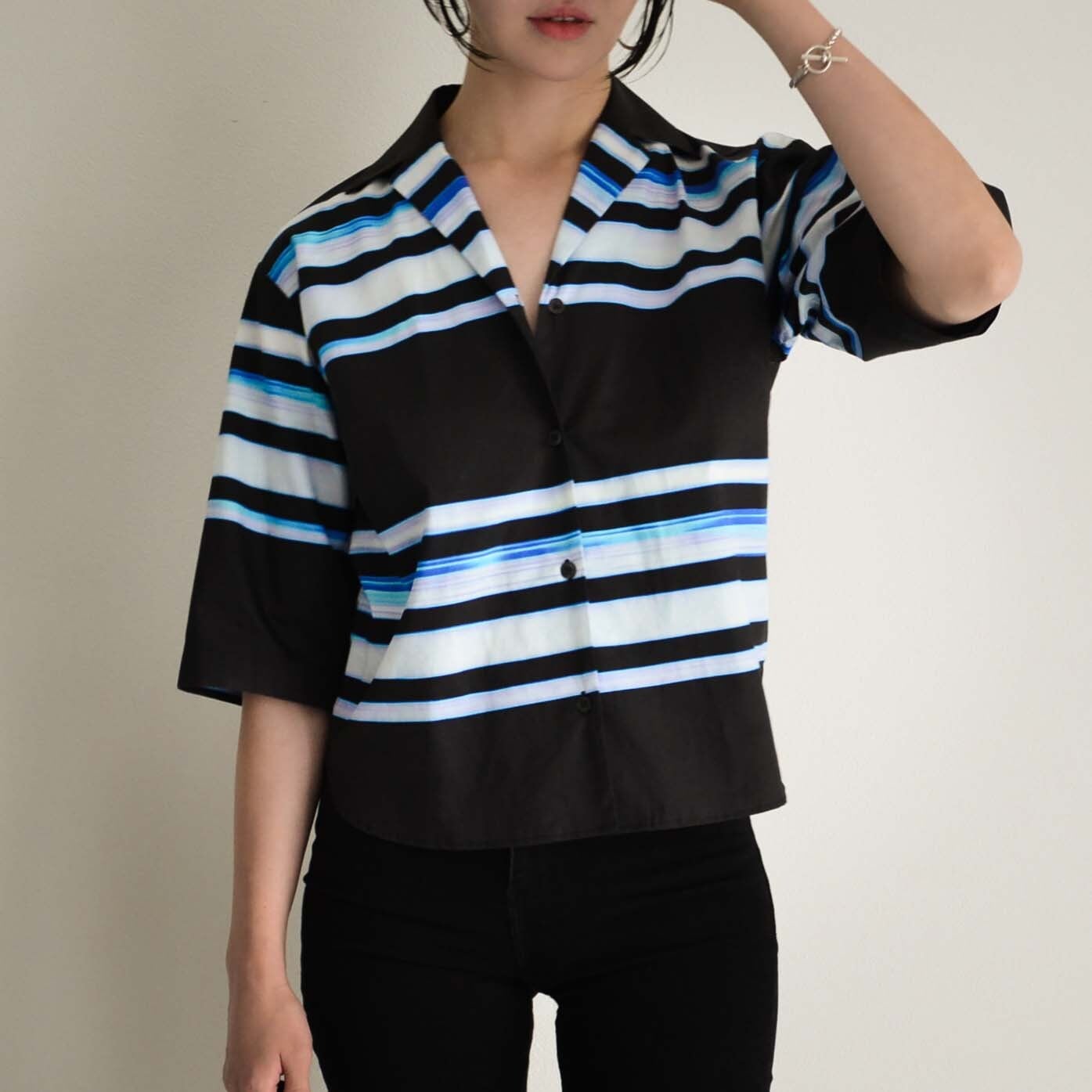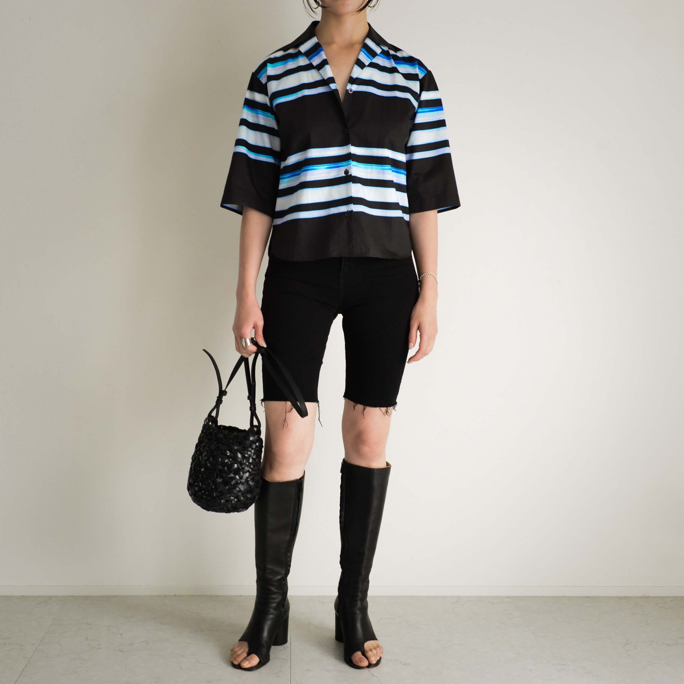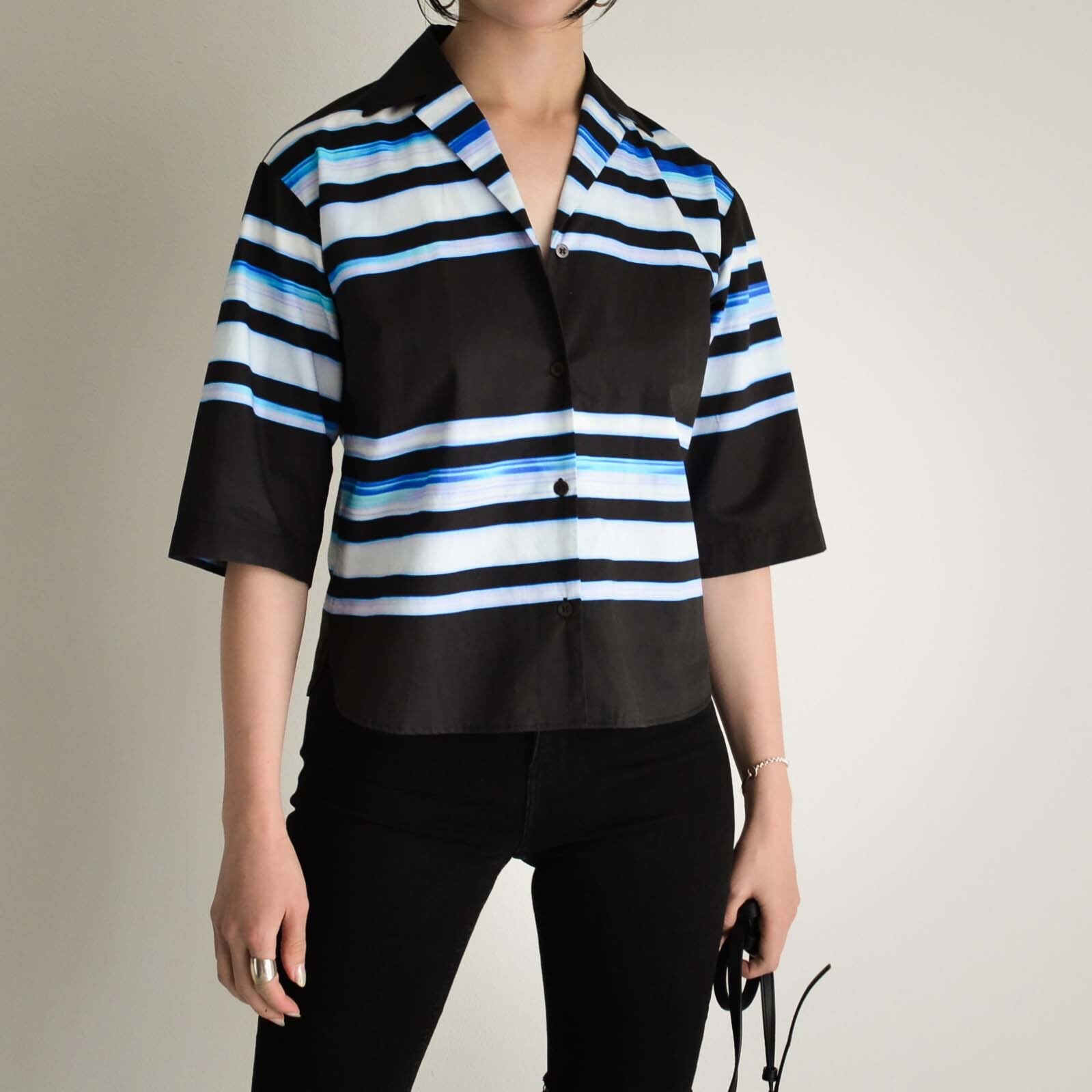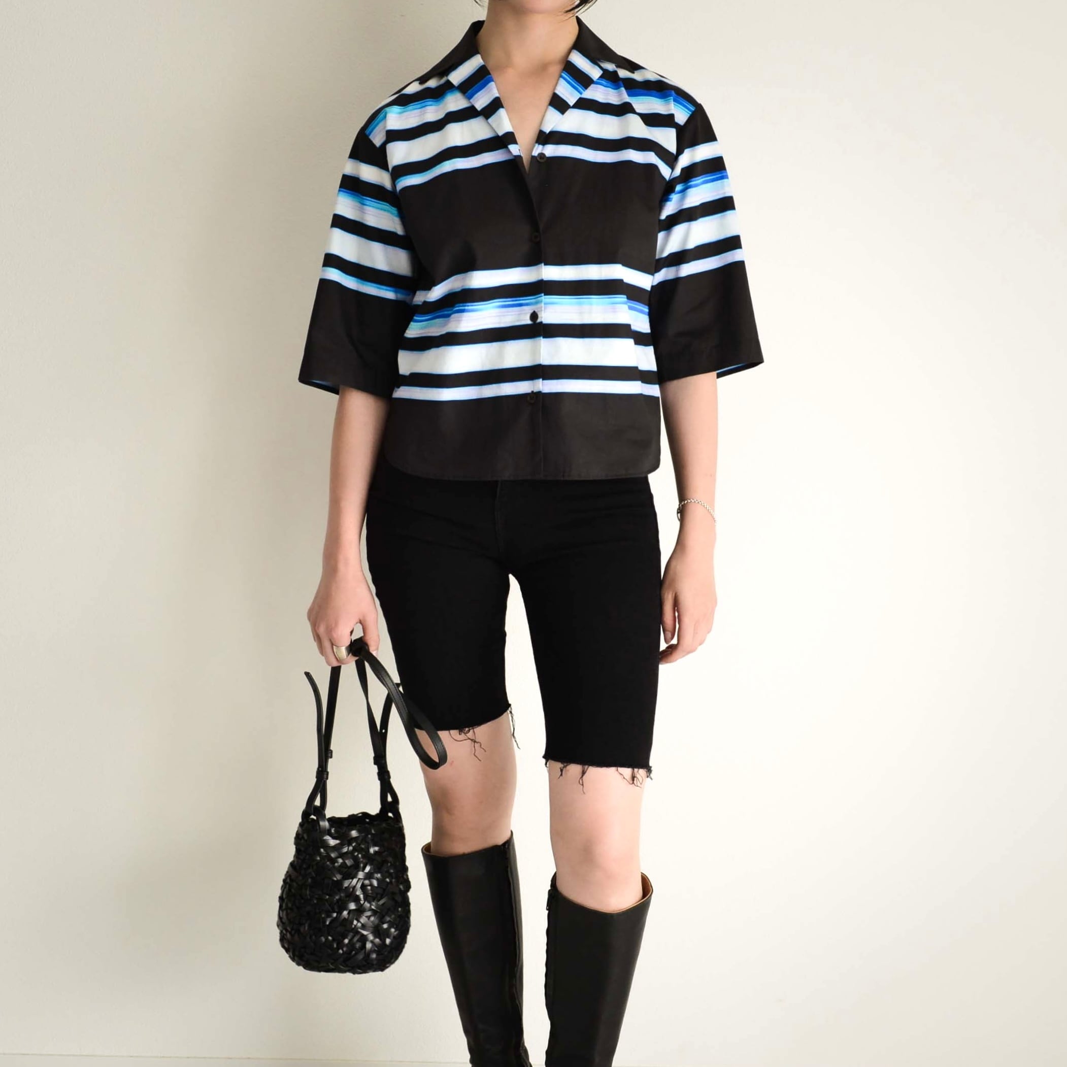 ハリがある高密度の上質なコットン素材にプリントされたのは、黒闇に走る閃光を思わせるホワイトとブルーのボーダー。