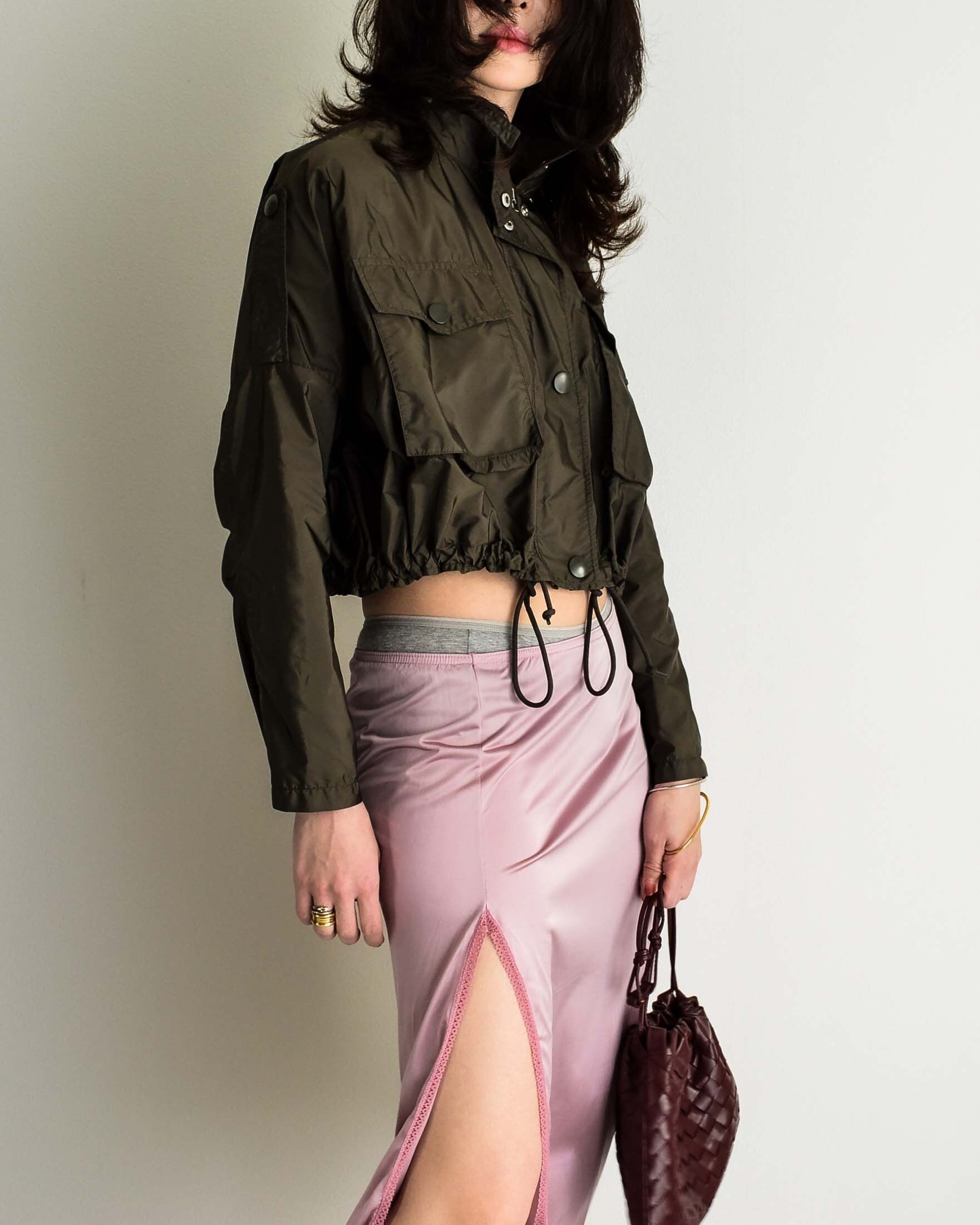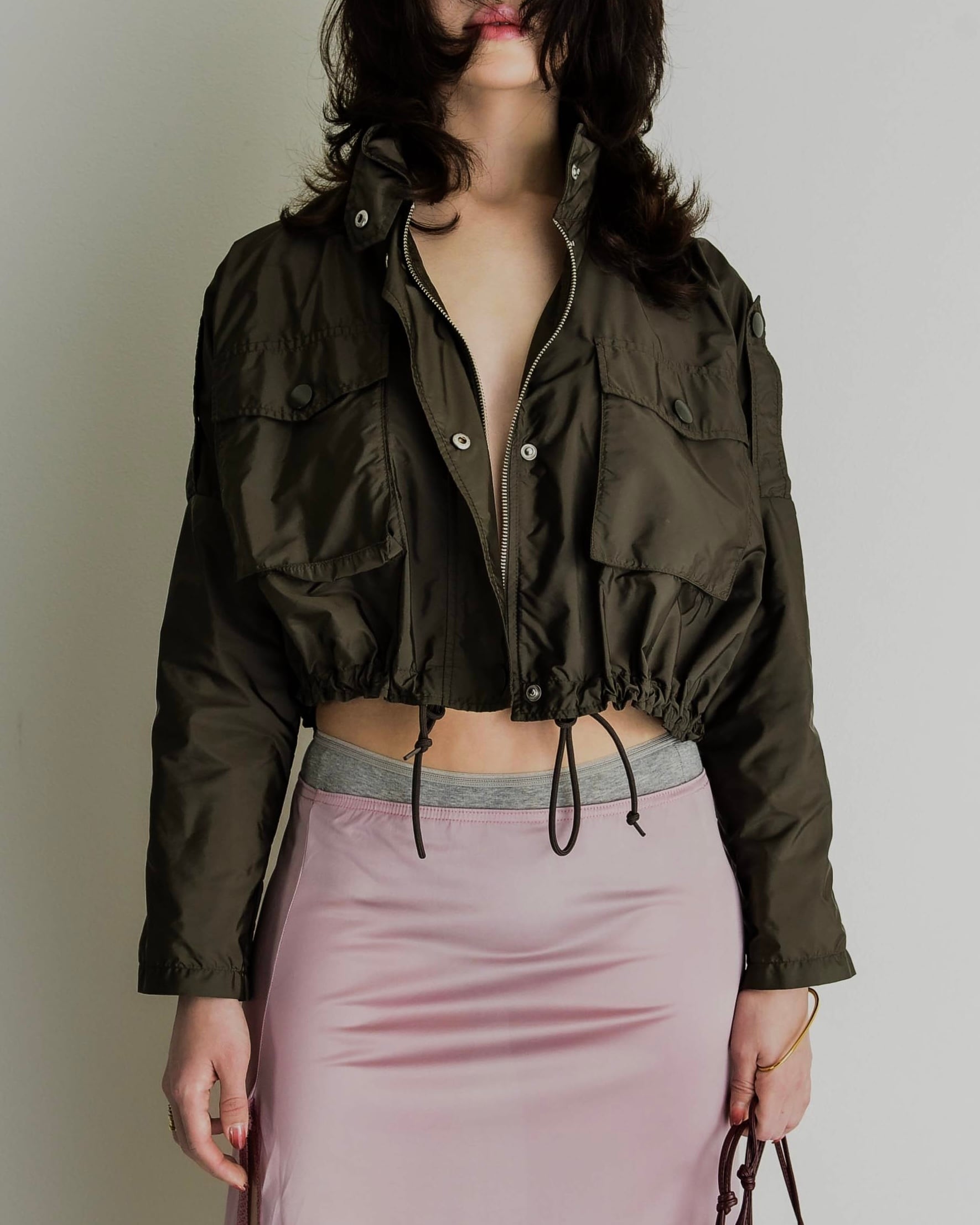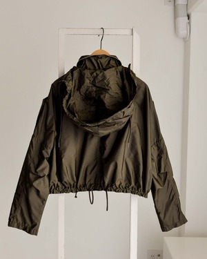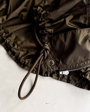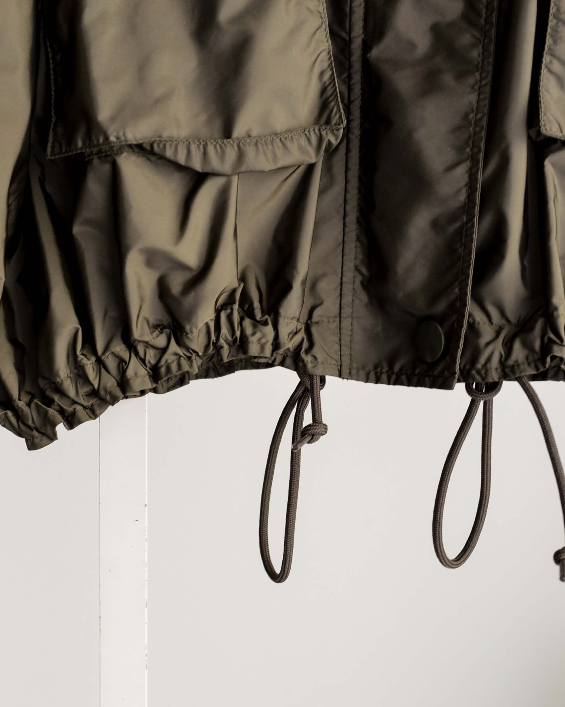 短めの丈の裾のコードをキュッと絞ると、ぷかっとした立体感とウェストとの対比が生まれます。
