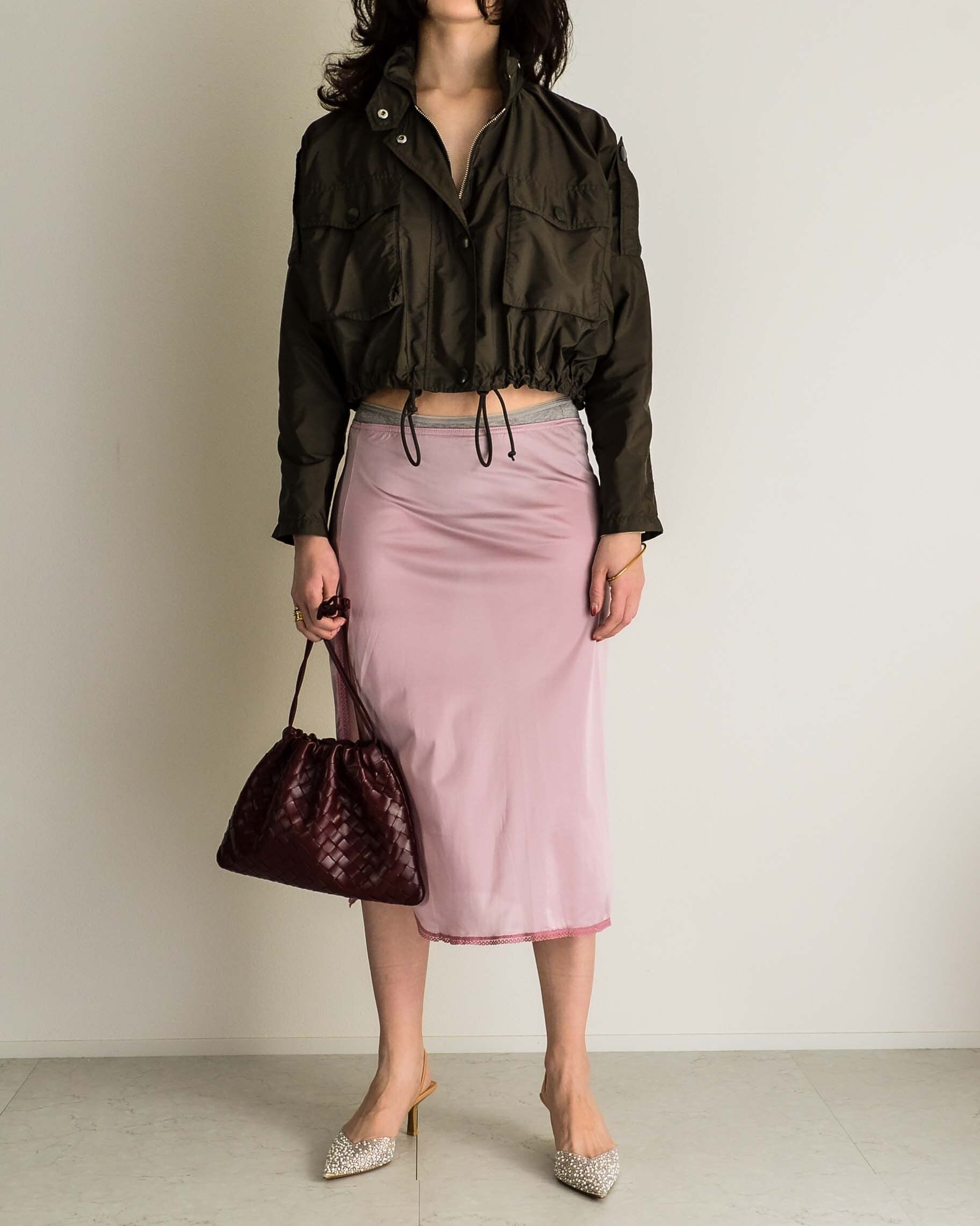 ランジェリーのような甘いアイテムと合わせたり、スラックスに合わせたり。