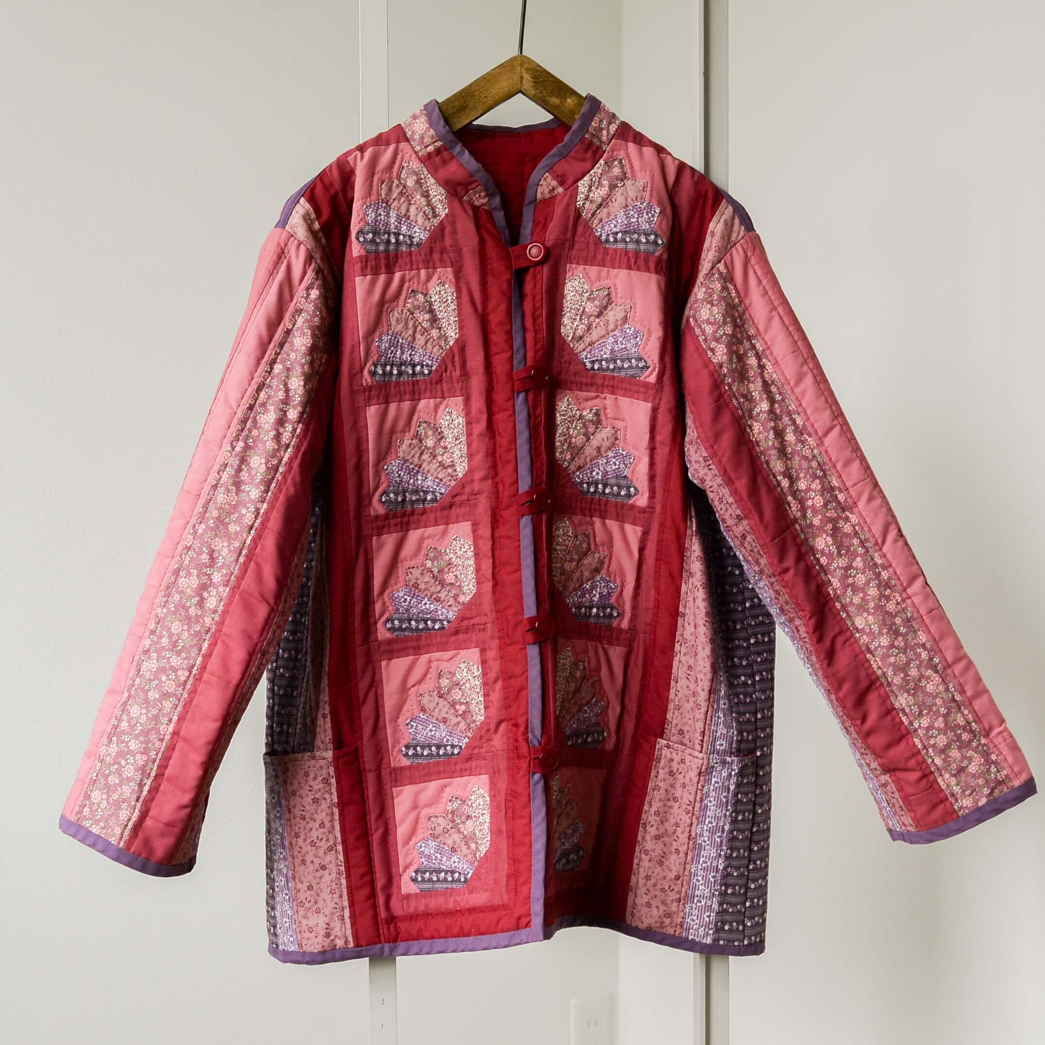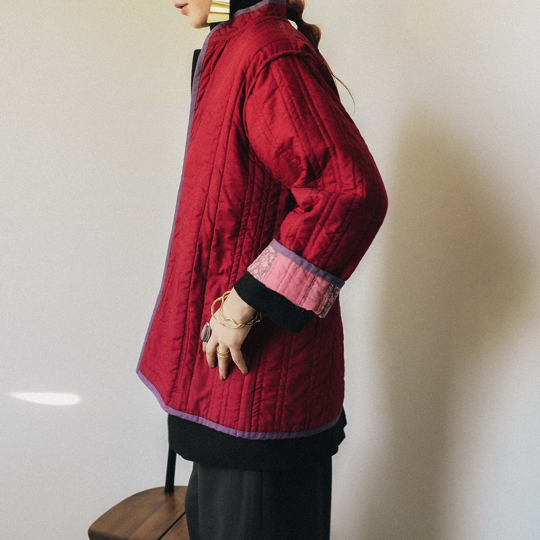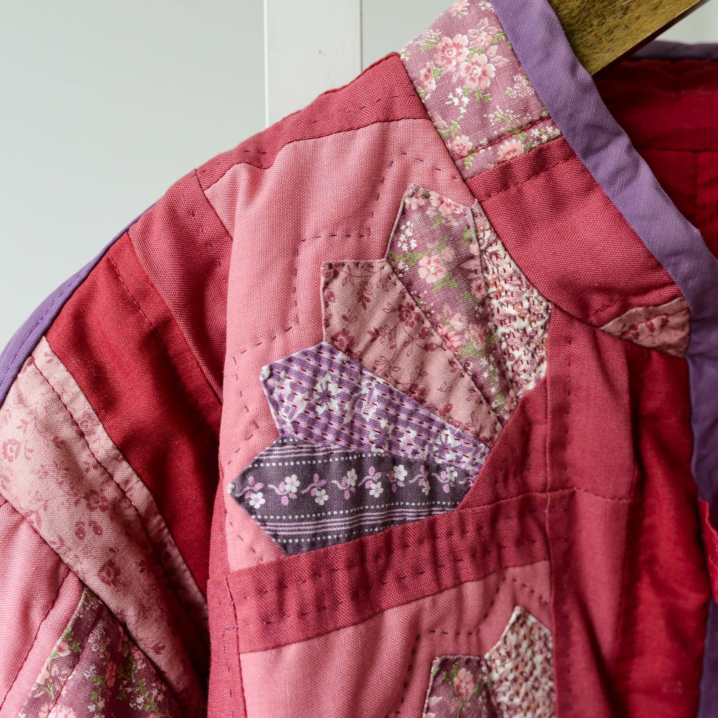 ローズレッド、モーブピンク、くすんだパープルの小花柄の色合わせがとても美しくすてきです。アメリカンビンテージならではのムード。フロントには細かいハンドステッチがたっぷり施され、裏返して無地で着たときにも綺麗です。