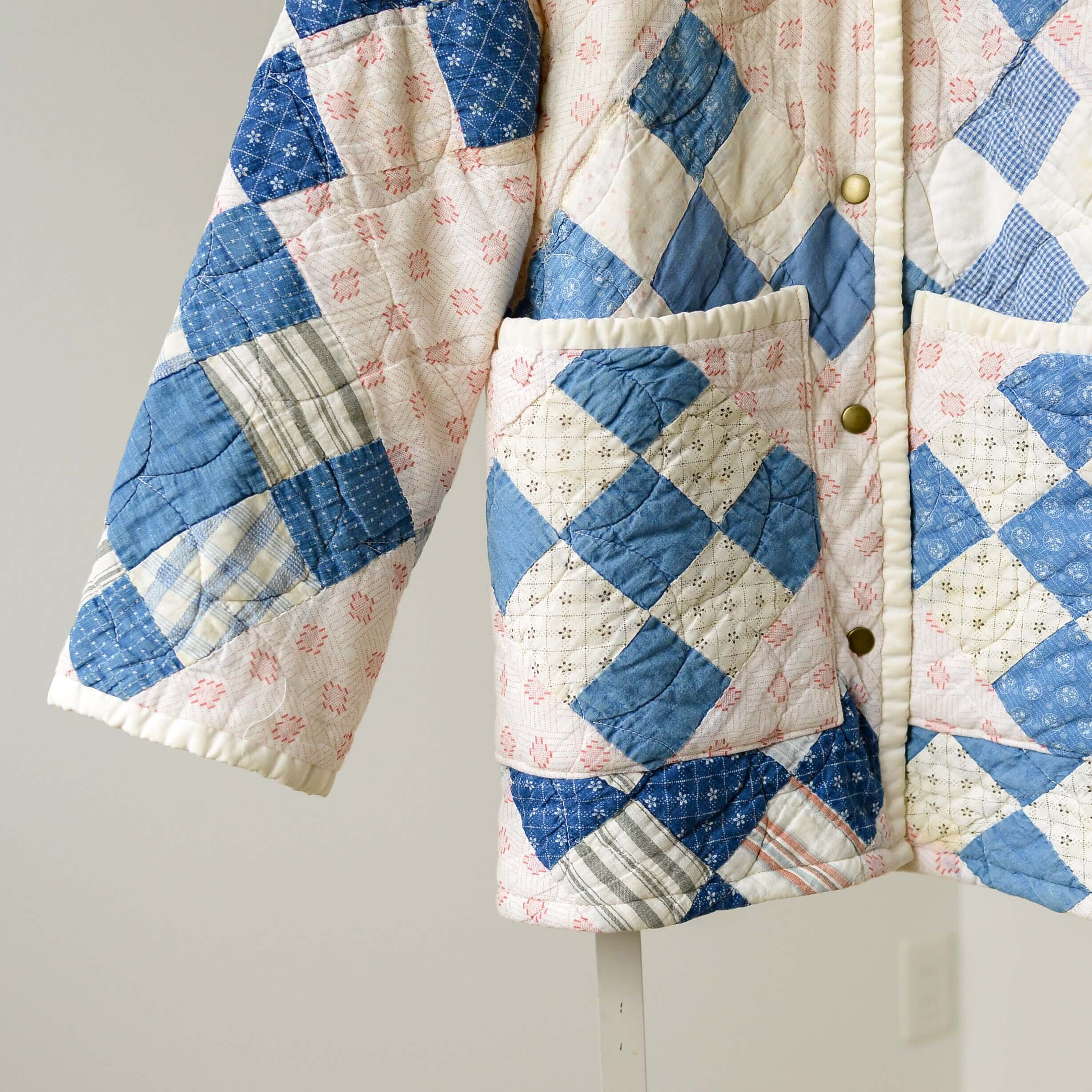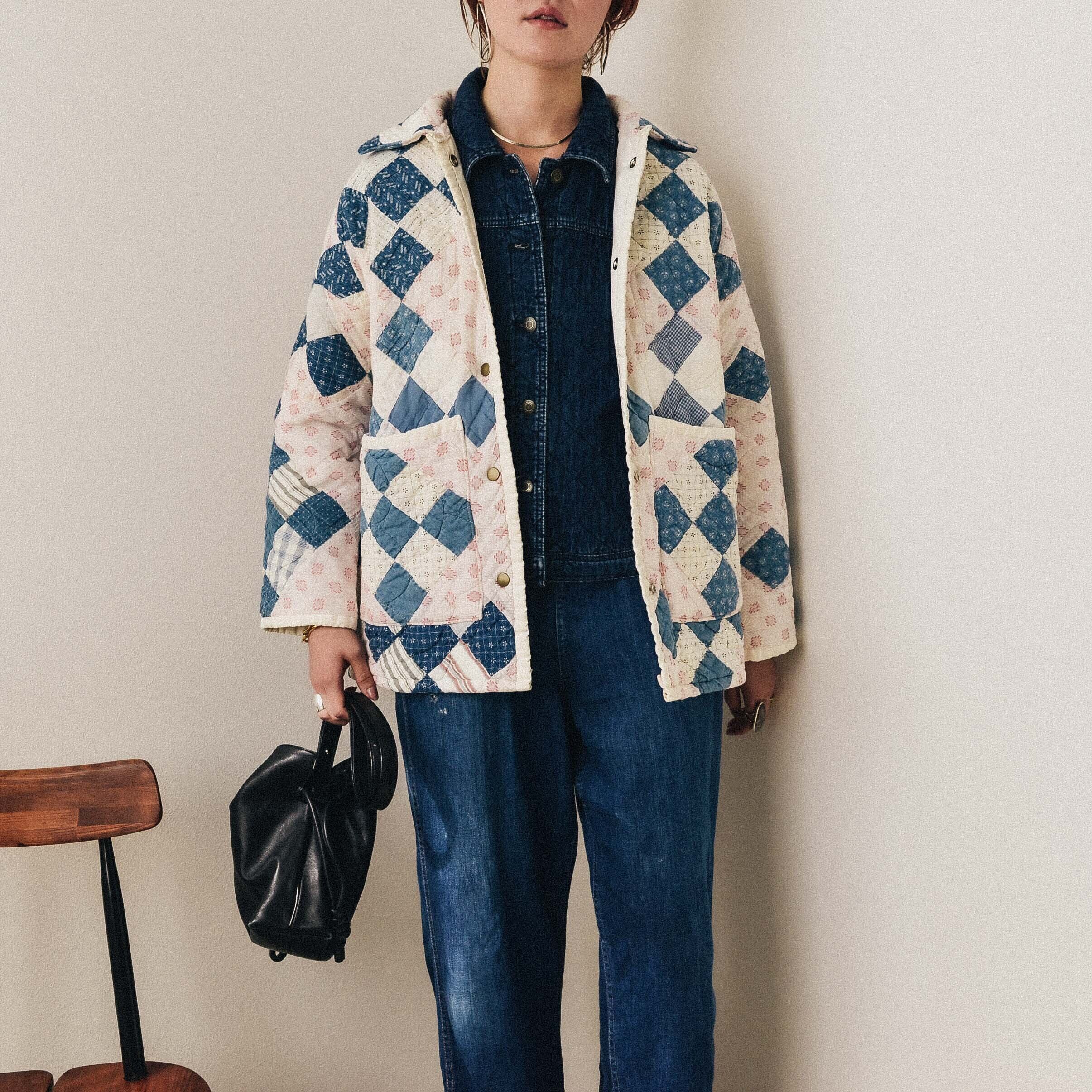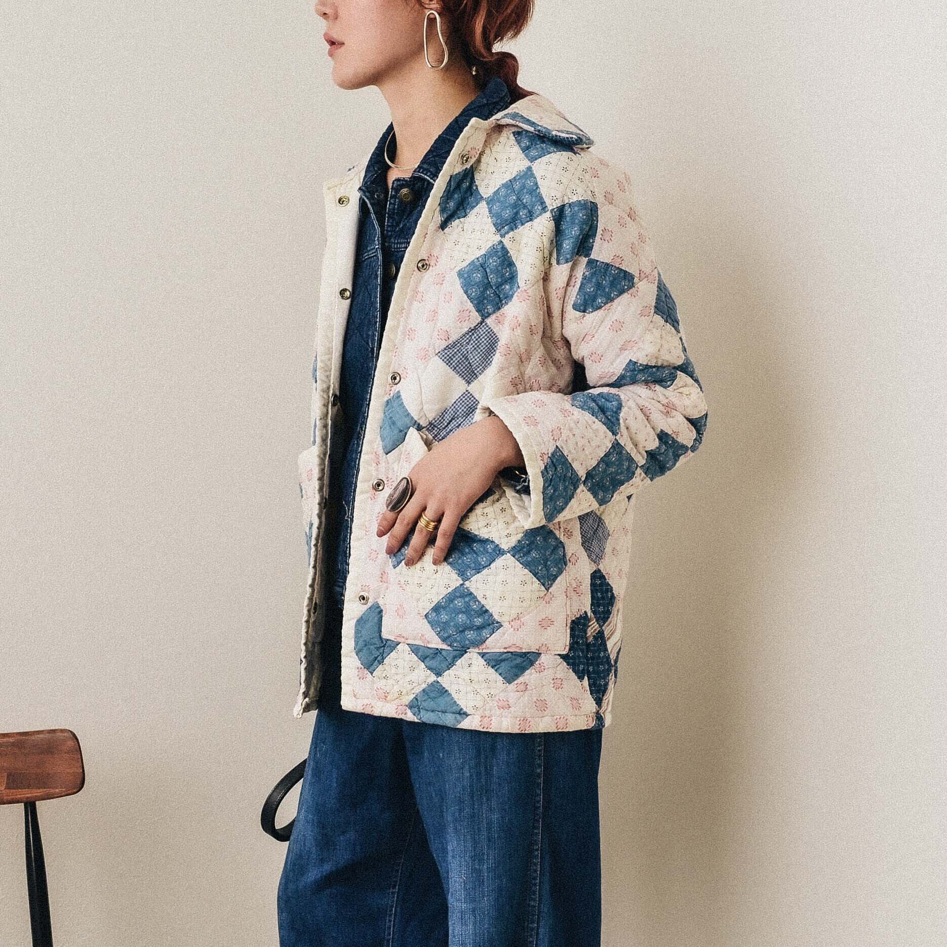 ふかふか柔らかな風合いのキルティングジャケット。水色とナチュラルホワイトの色合いが爽やかな印象。あまり見かけないホワイトベースのパッチワークは抜け感があってすてきです。