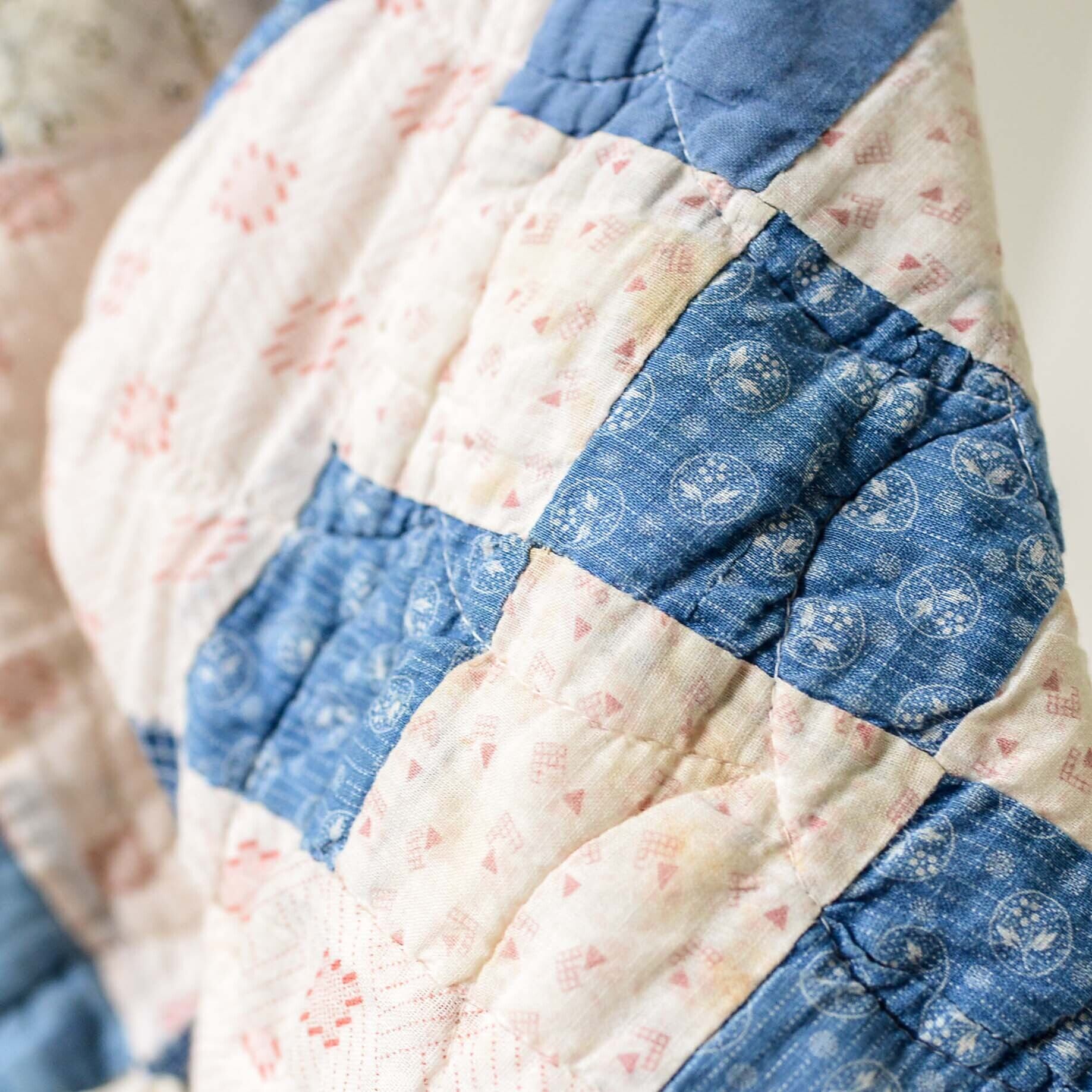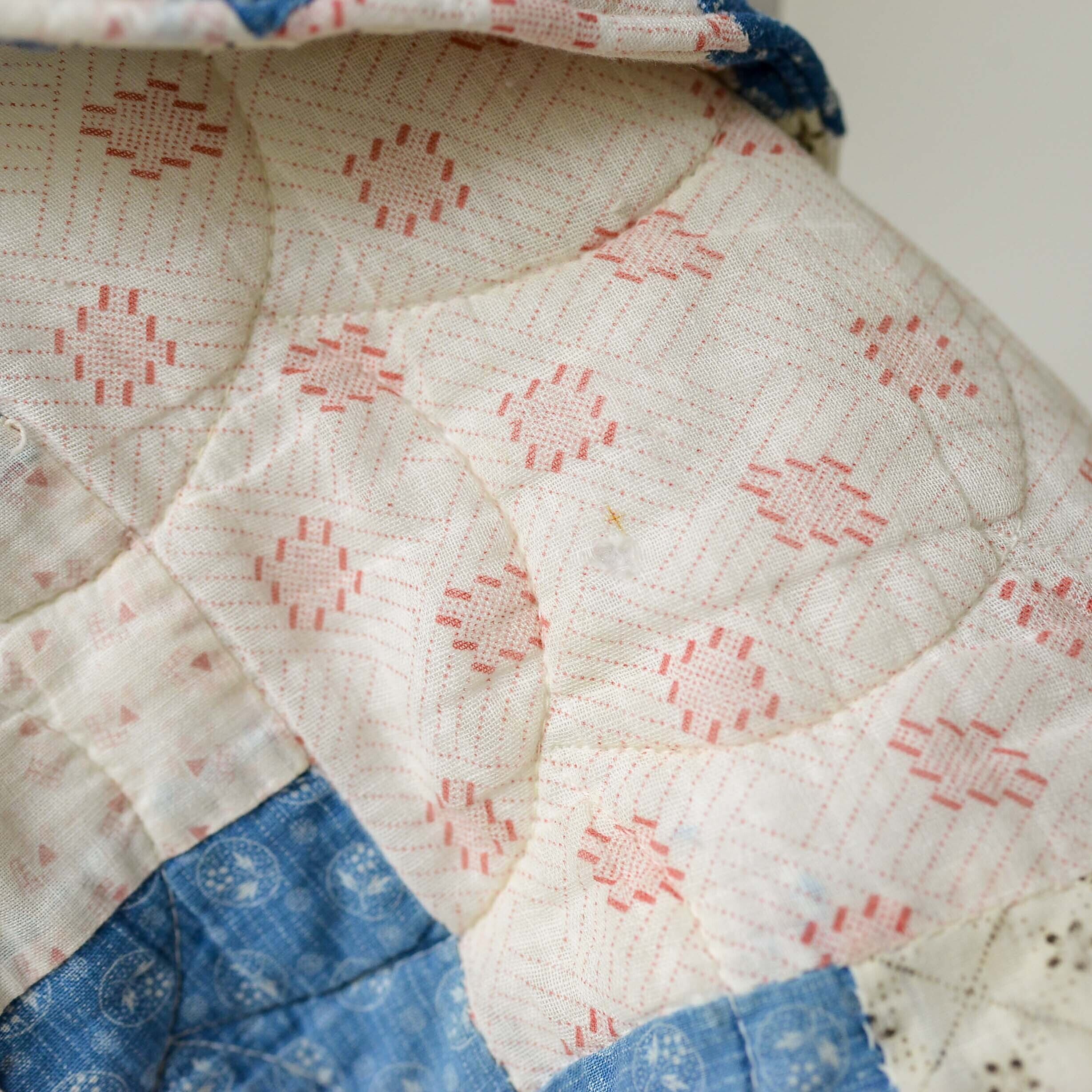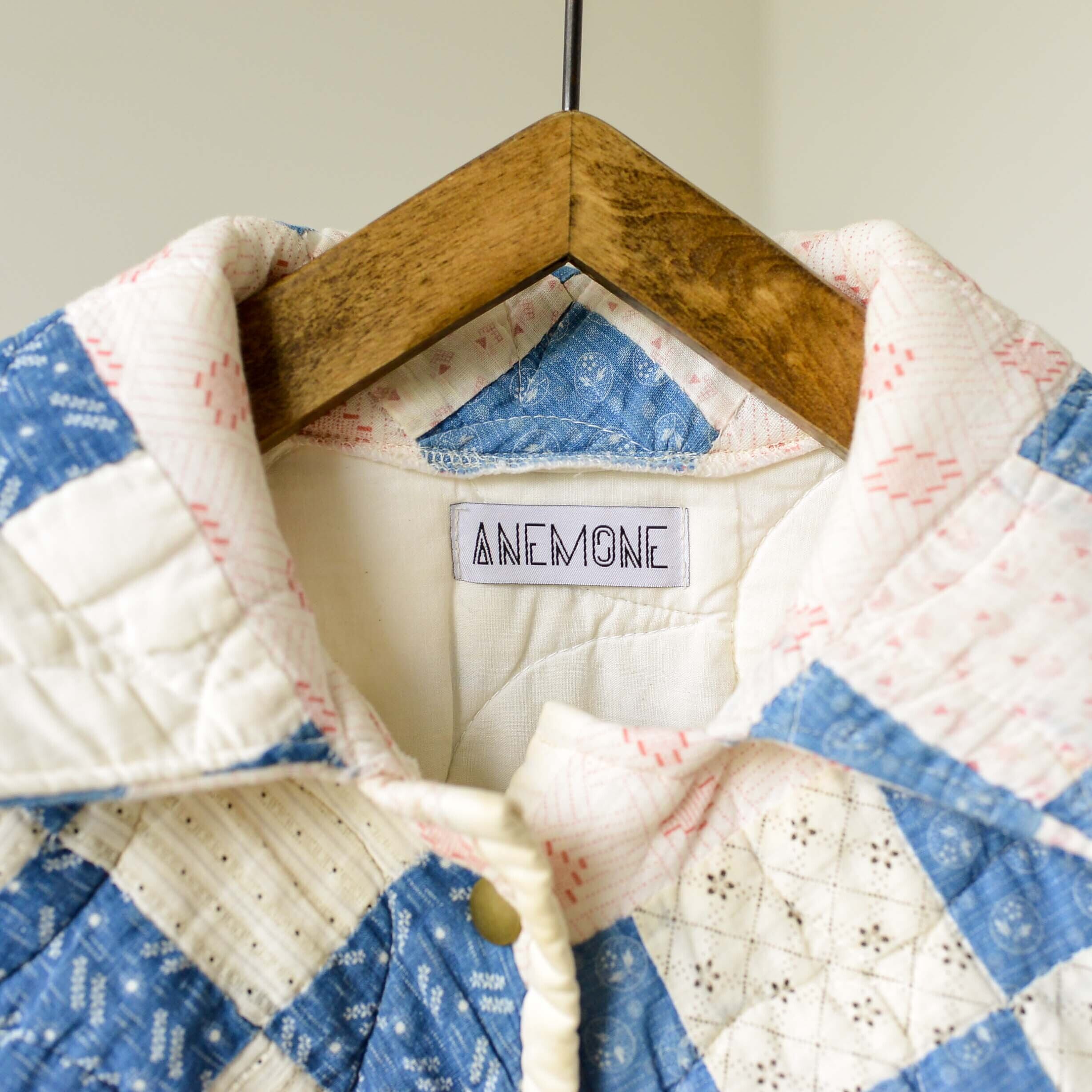 ふかふか柔らかな風合いのキルティングジャケット。水色とナチュラルホワイトの色合いが爽やかな印象。あまり見かけないホワイトベースのパッチワークは抜け感があってすてきです。
