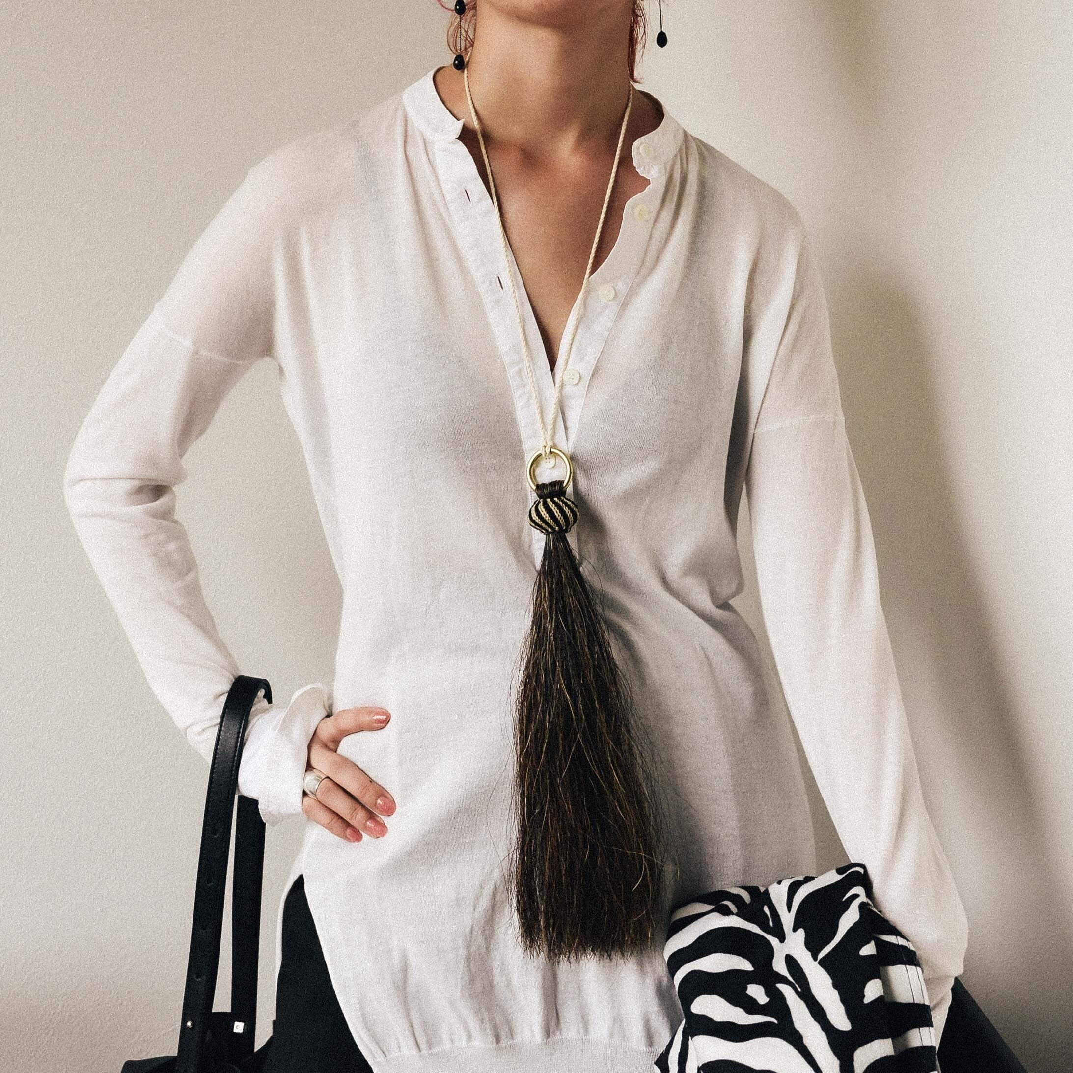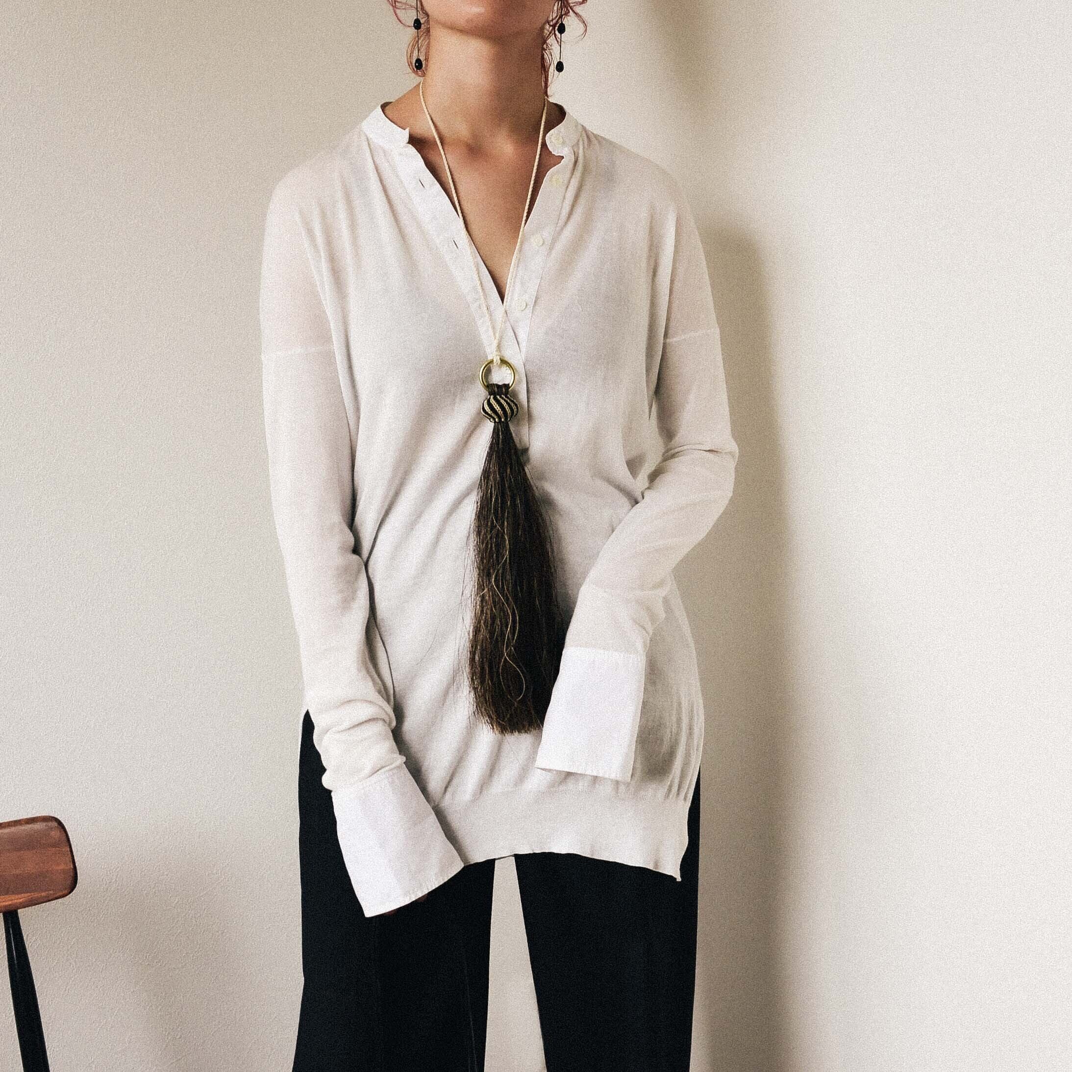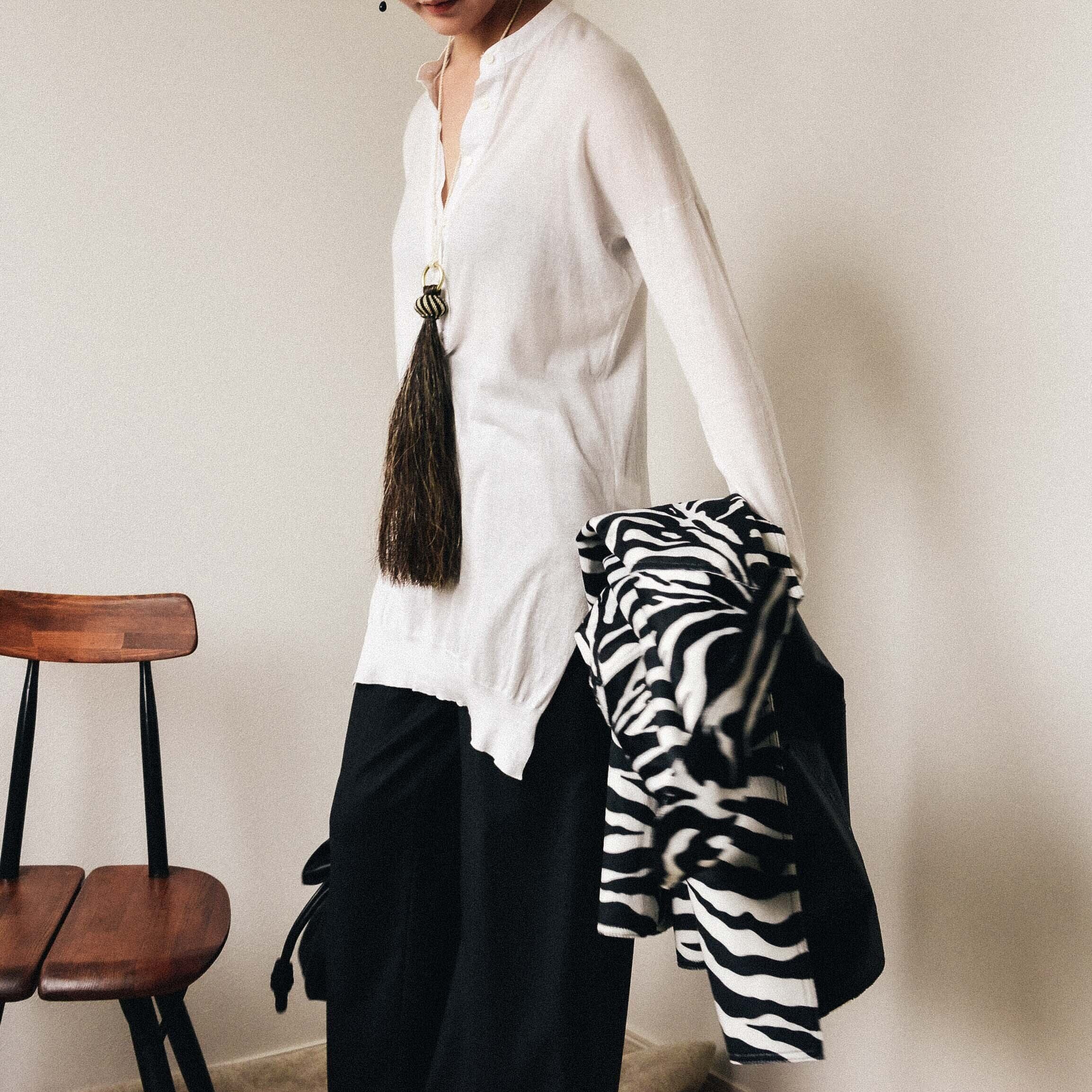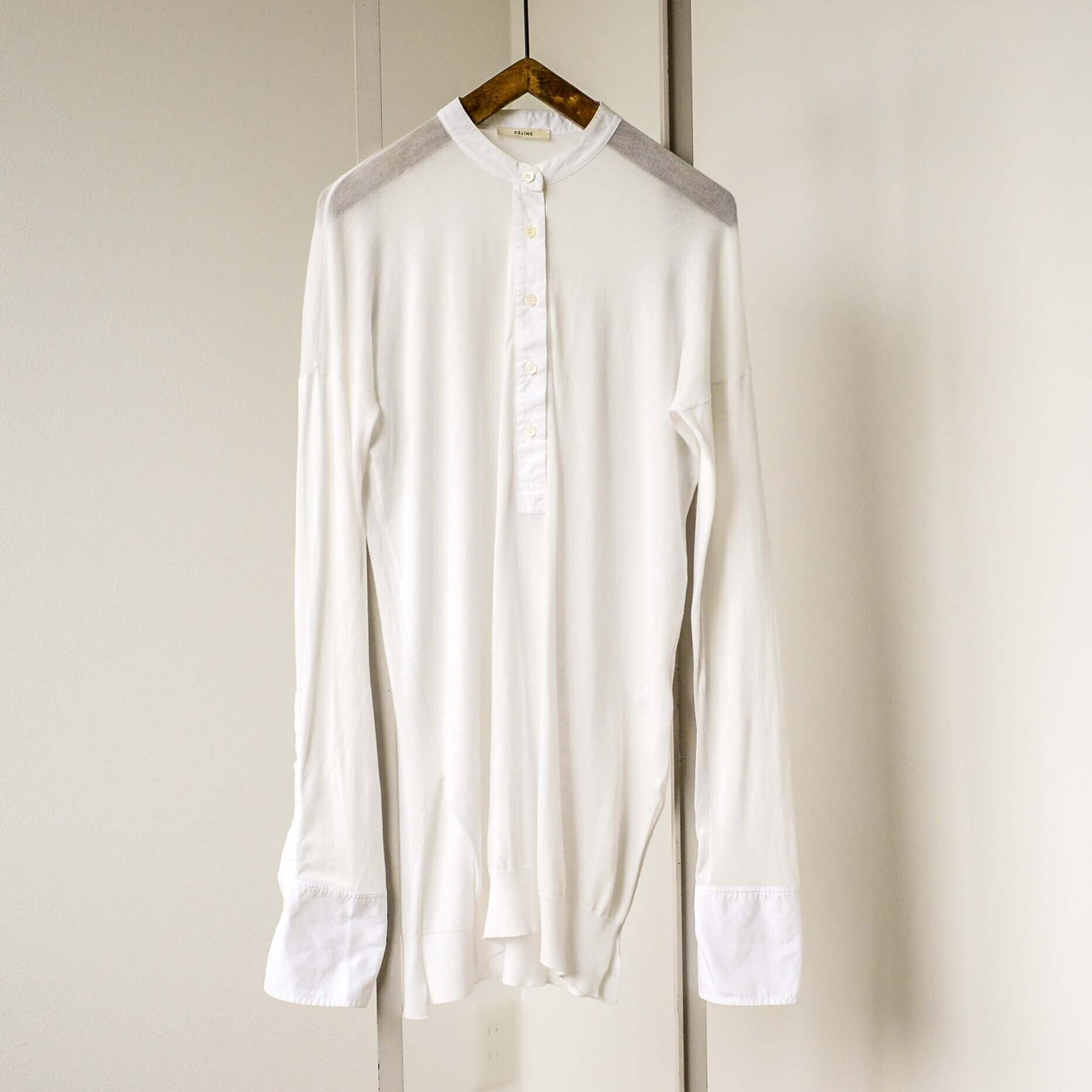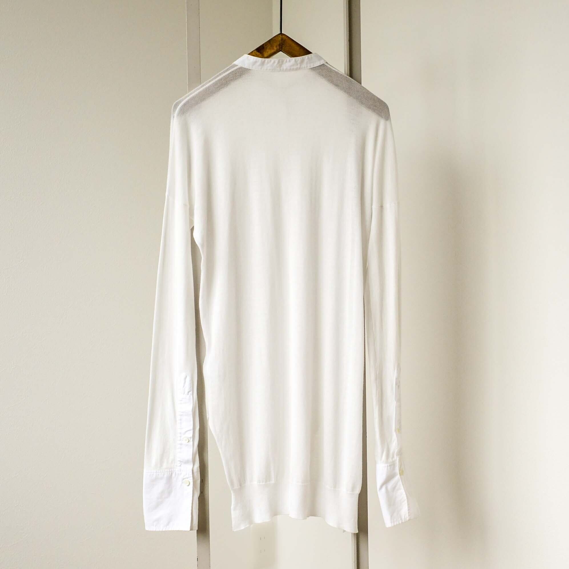 バンドカラーシャツをニットで再現したようなデザインで、襟、前立て、カフスはハリのあるシャツ生地。ニュートラルな印象の黄みがないホワイトがクール!