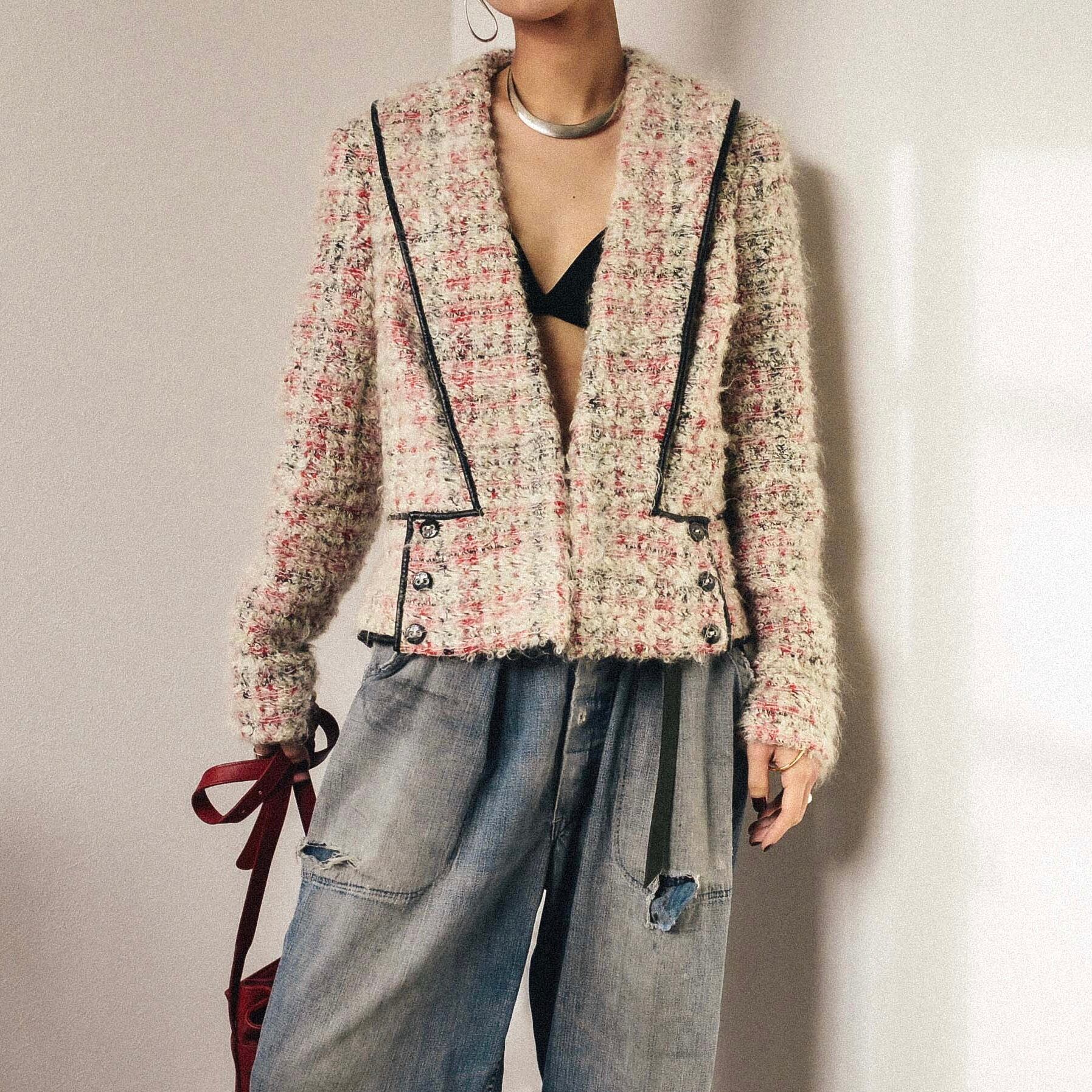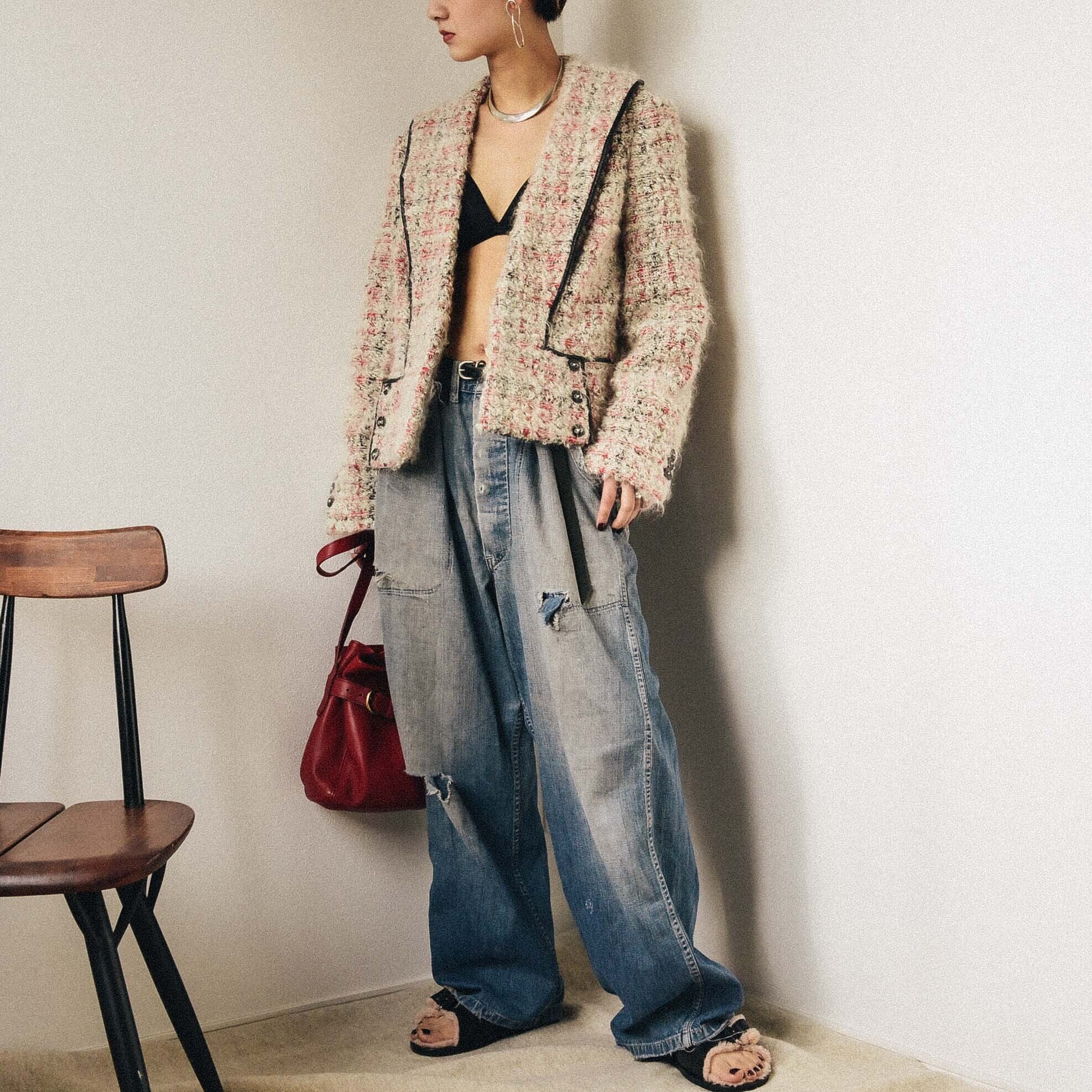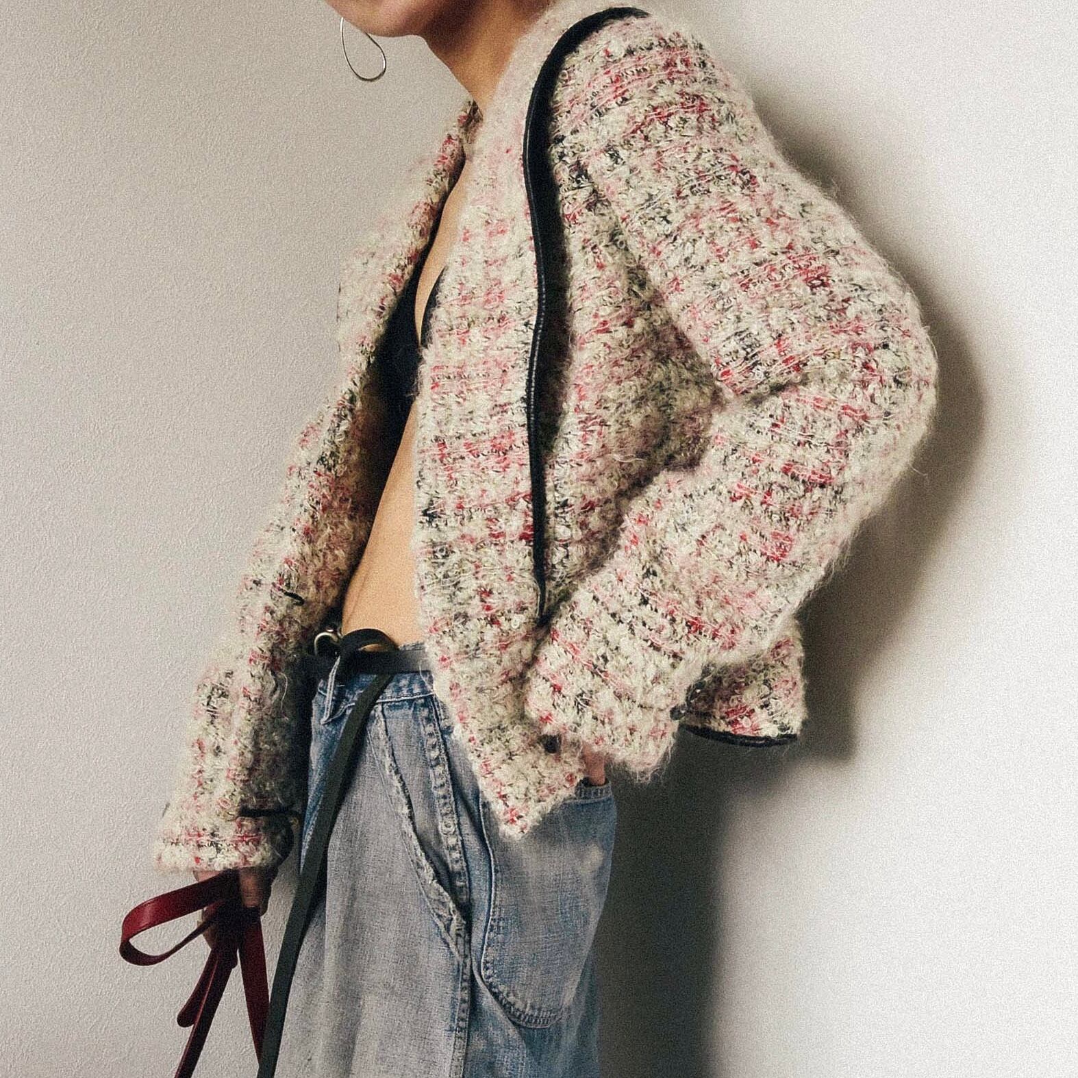 一般的にコンサバティブなものが多いツイードジャケットですが、このジャケットはフェミニンになりすぎず格好良いムードで着れます。