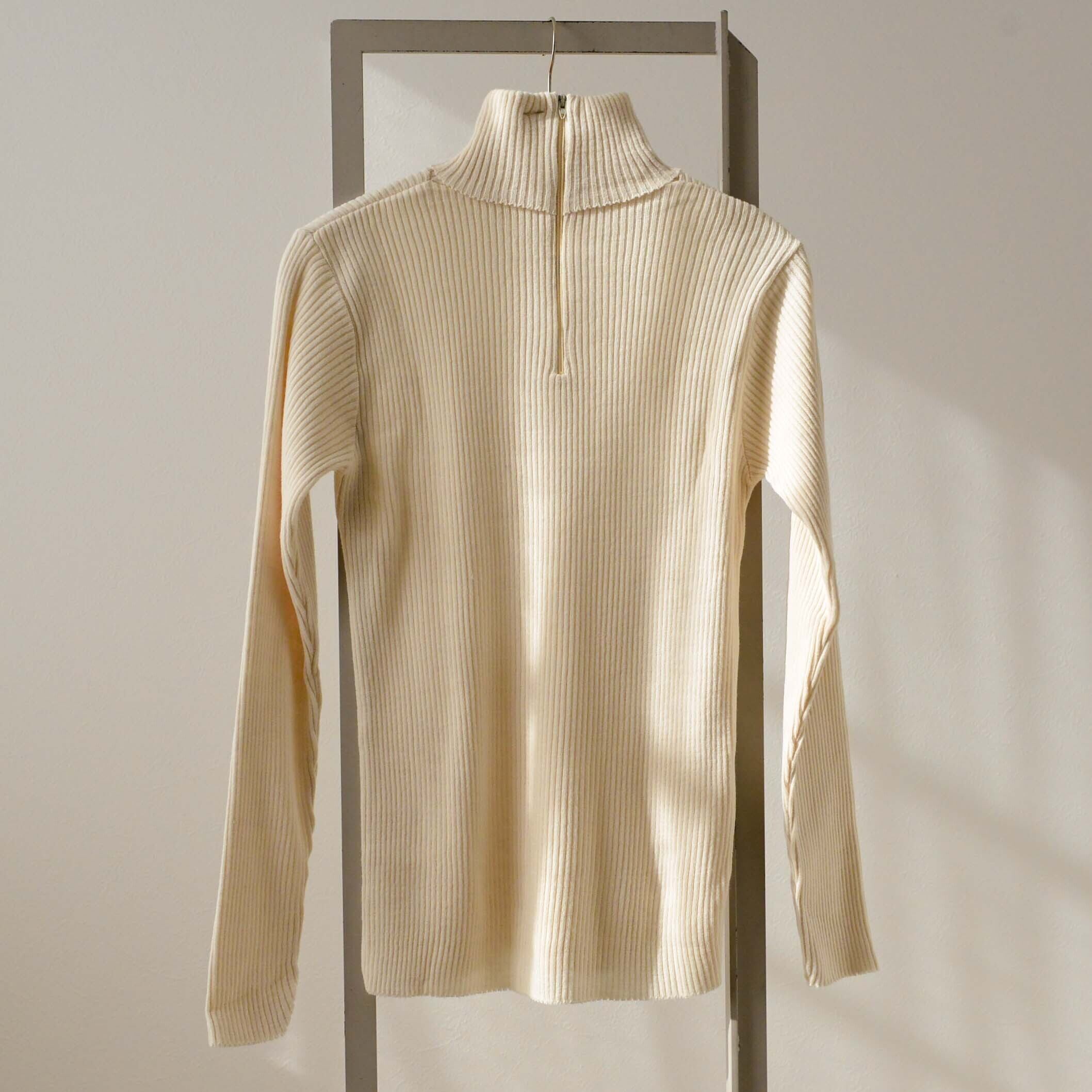 前側に着てジップを全て閉めると顎に当たり不快ですが、3cmほど閉めたぐらいが程よく襟が立ち上がり縦のラインで首元に抜けが出るのでレイヤードのアクセントにおすすめです。(タグは外してご着用下さい)