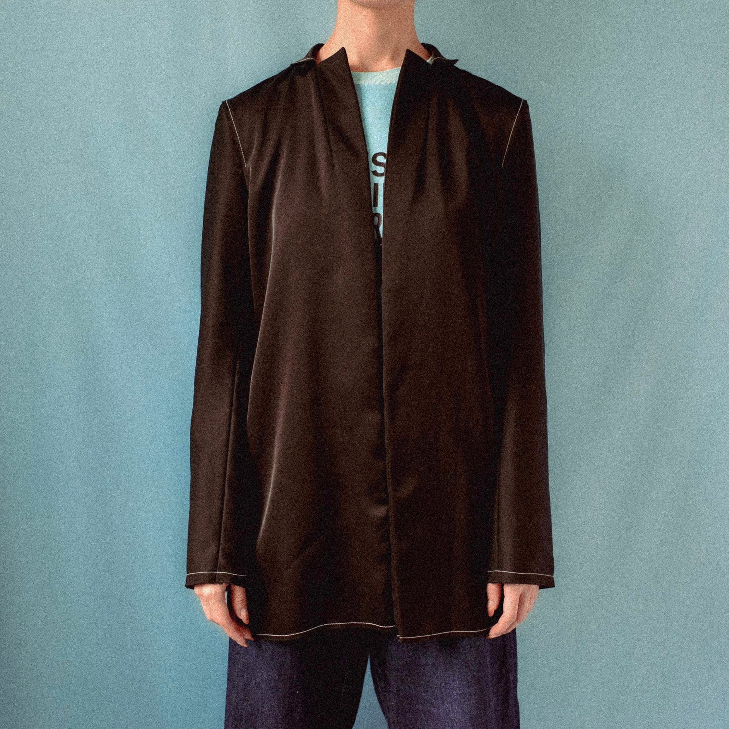 ボタンがないオープンフロントで、左アームホールからぺろんと付いた帯状のベルトに、反対側の身頃を止める仕様です。