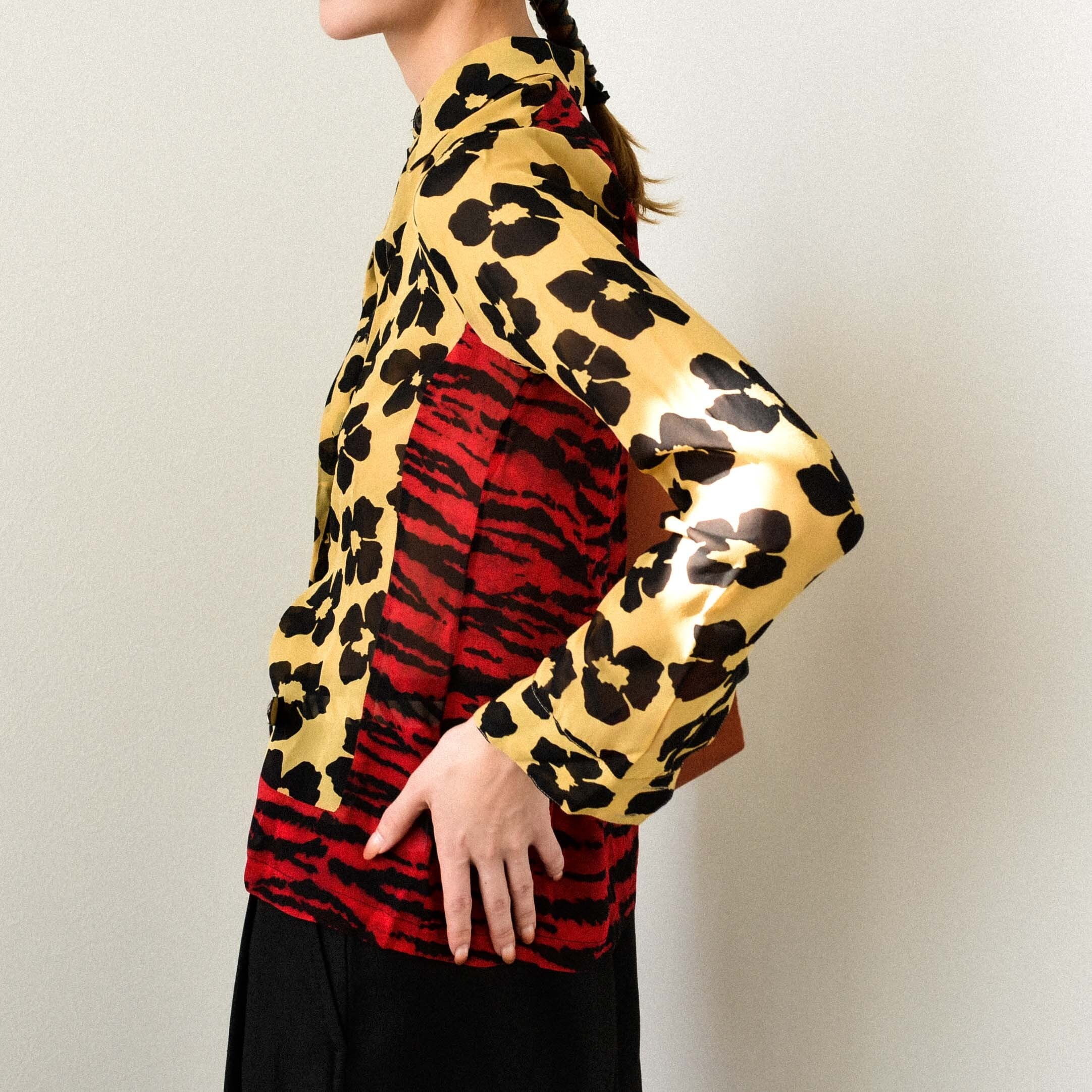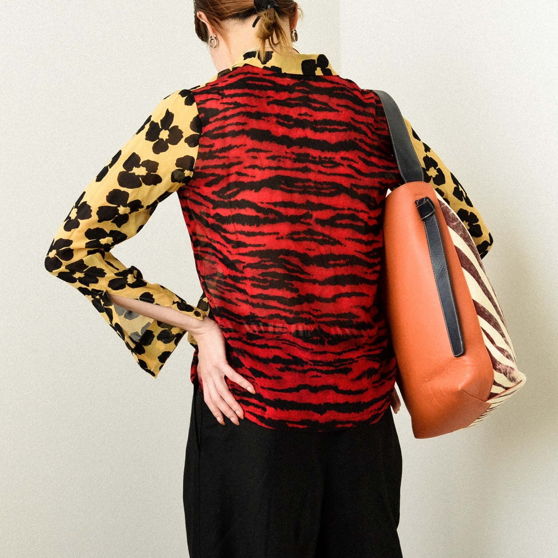 フロントはレオパードと花をミックスしたような柄、裾と背面は深い赤をベースにしたトラ柄。一目でdriesとわかるdriesらしい柄合わせのデザイン 。