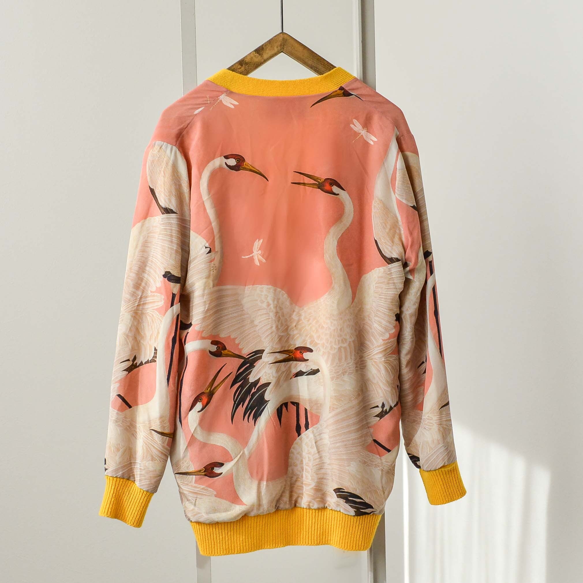 すべすべ極上の手触りのシルクに描かれているのは舞い踊る鶴とトンボ。