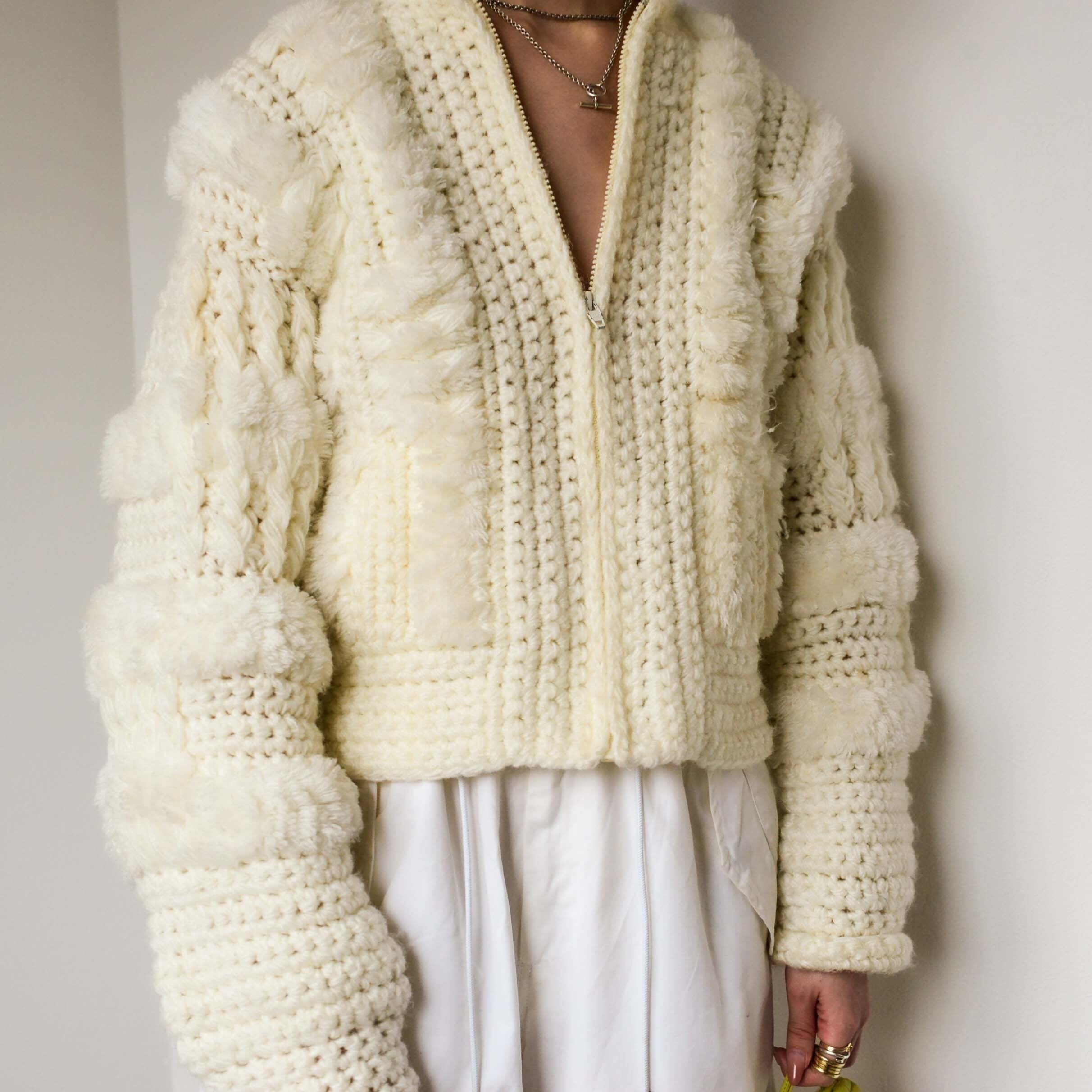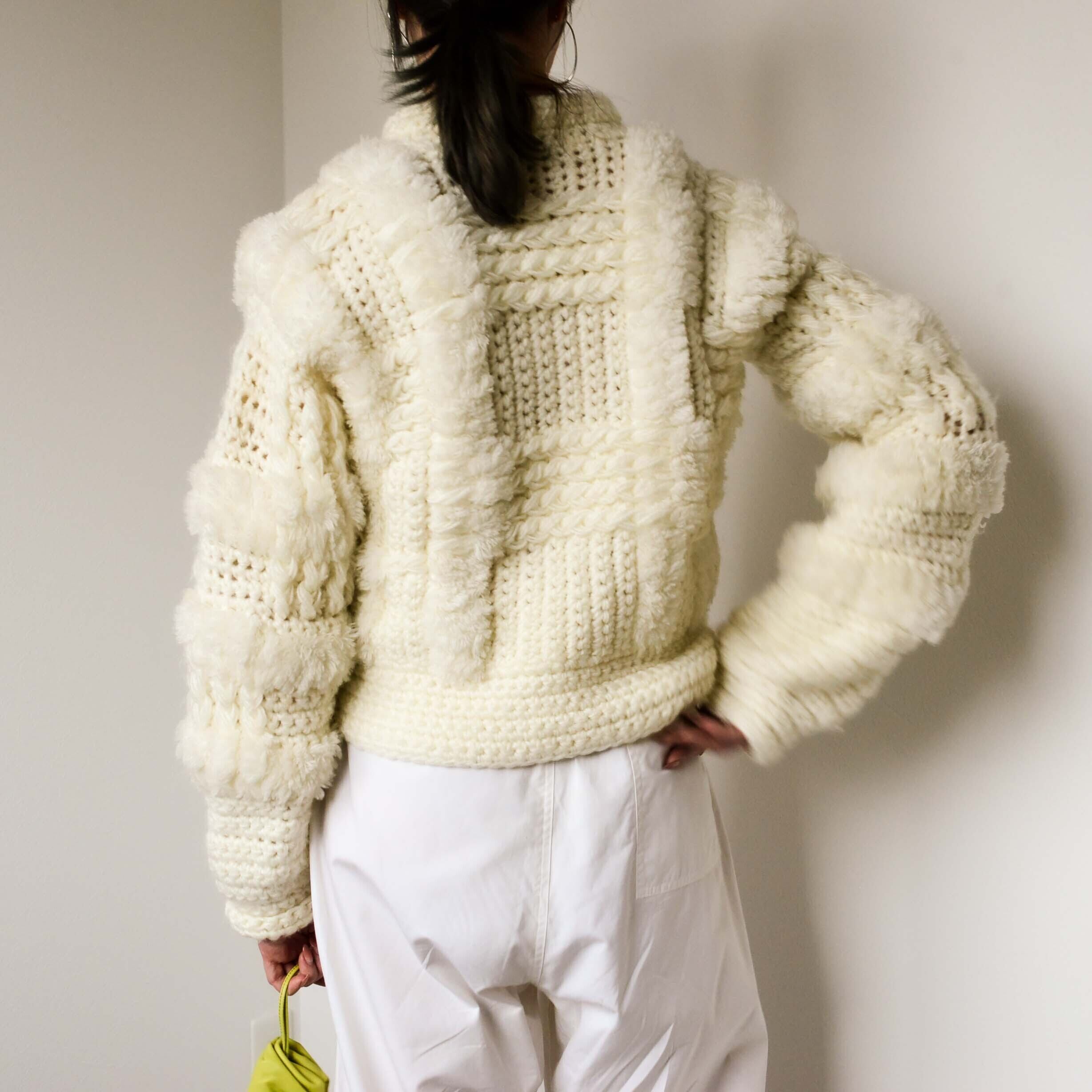 シャギー状にカットされたフサフサやケーブル編みなど表情豊かな編み地で手仕事の美しさとあたたかみを感じる凝ったデザイン。