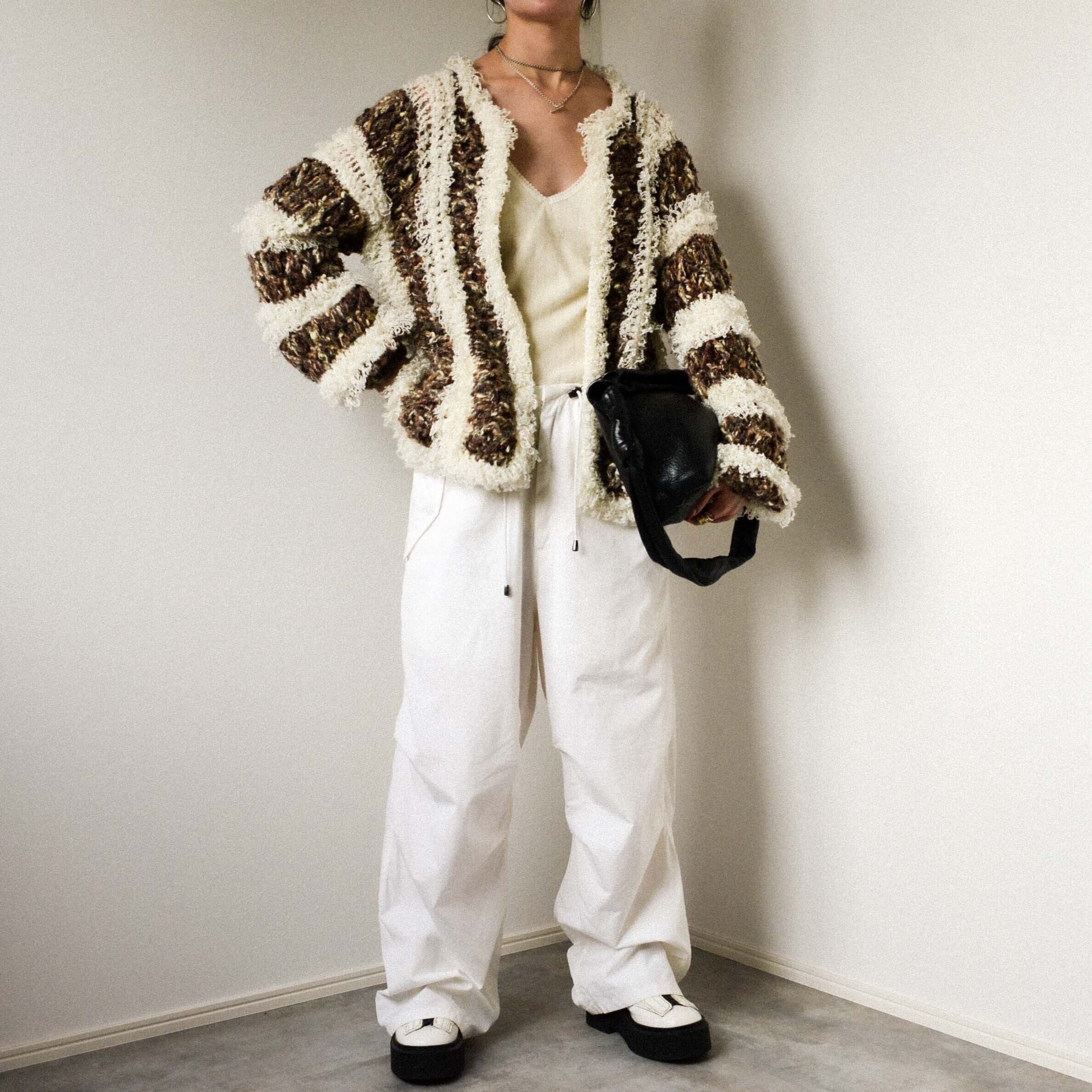 ウォーミィなブラウンのmixもこもこブークレ糸と、やや細めのループヤーンの組み合わせがノマドな雰囲気。