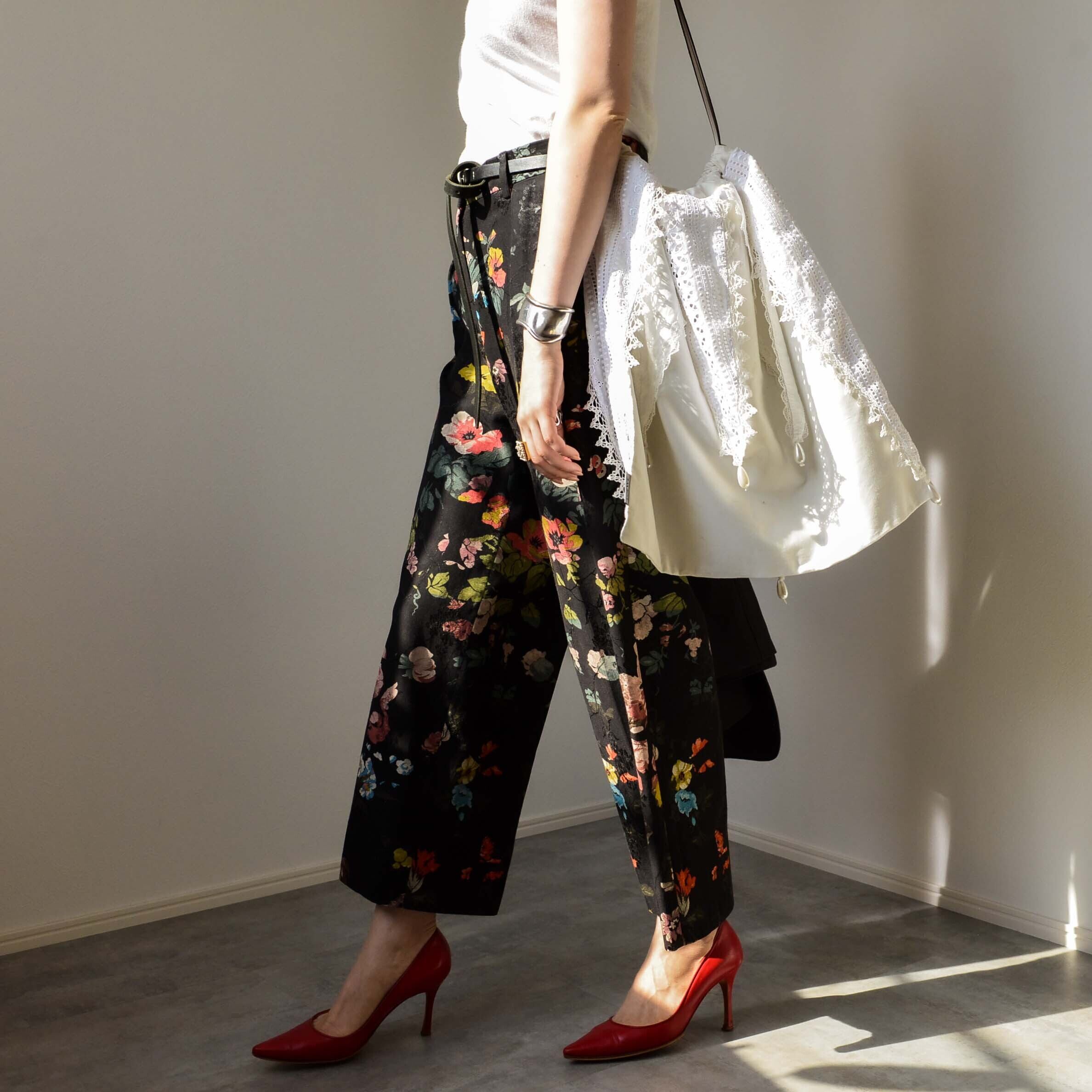 黒をベースにした、大胆でいて落ち着きとモダンを感じる甘さ控えめの花柄。