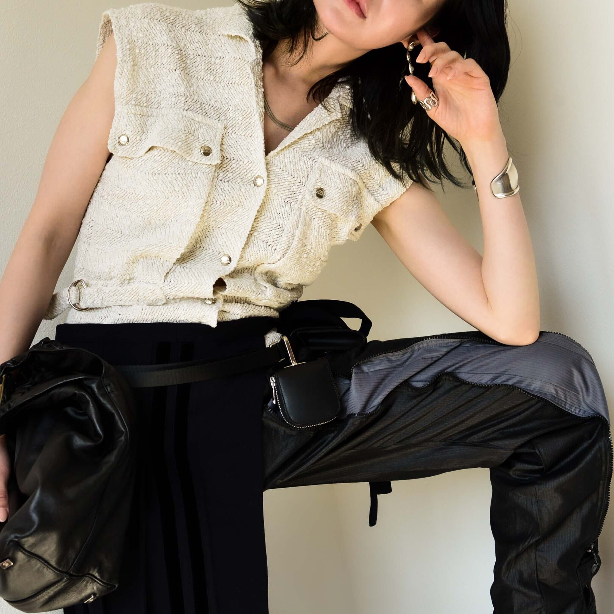 アームホールが大きいのでゆるりとしたシャツとのレイヤードもおすすめ。