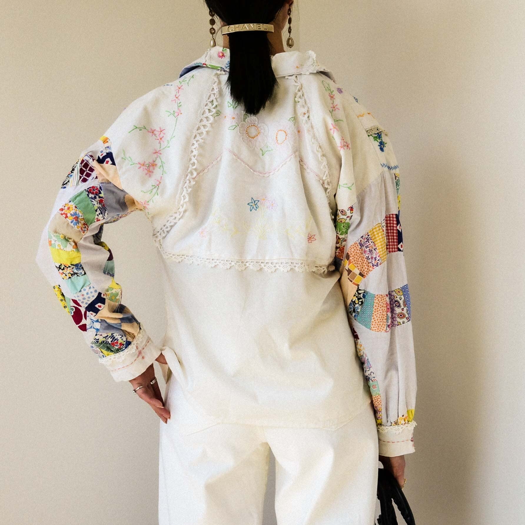 Sharo Smithの作品は、古い年代のハンドメイドのテーブルクロスやカバーなどを用いて作られているため、すべてが一点もの。