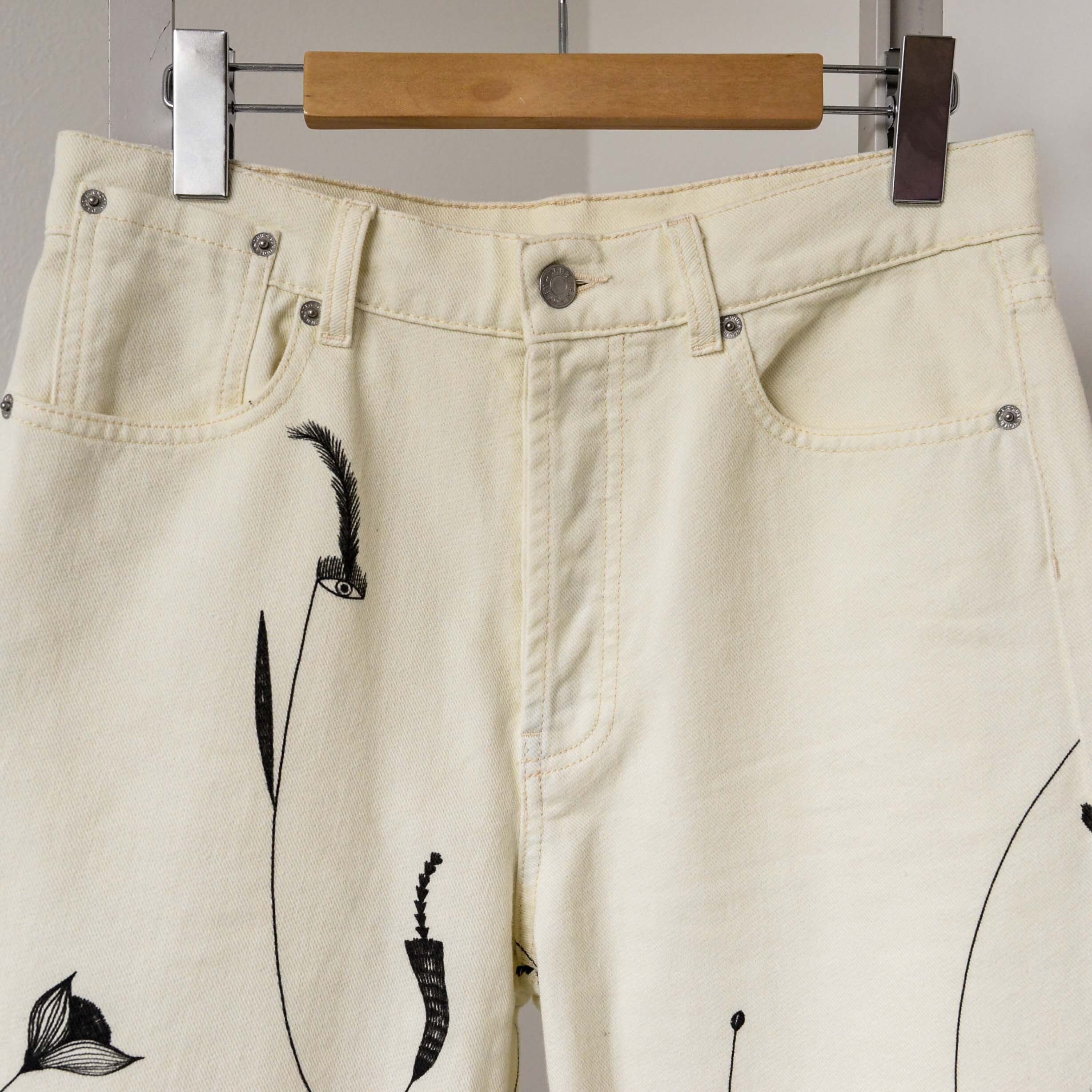 ニュアンスあるアイボリー色のベースに、手描きのようなタッチの、繊細でいてちょっと不思議なアウトサイダーアート画がプリントされています。